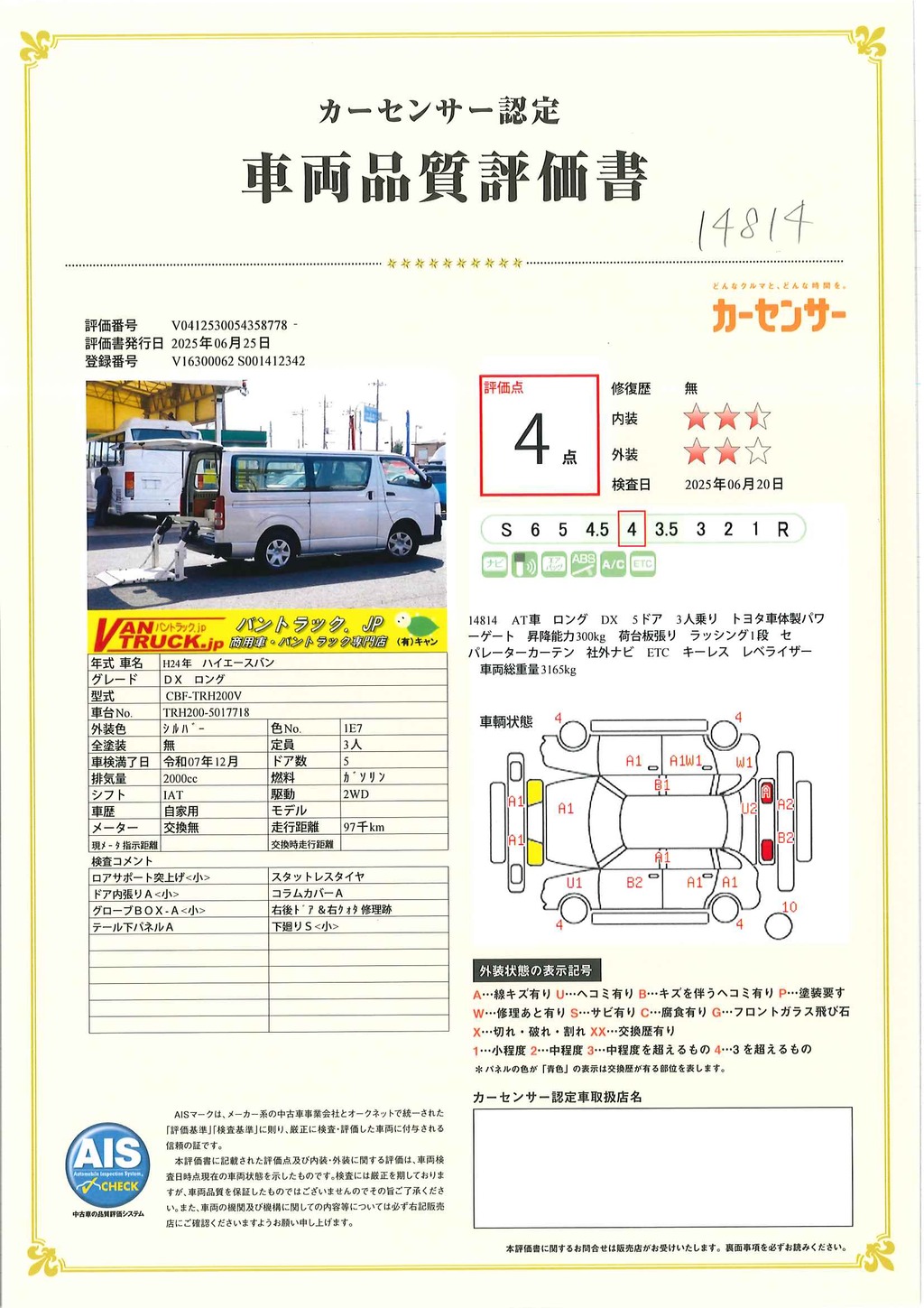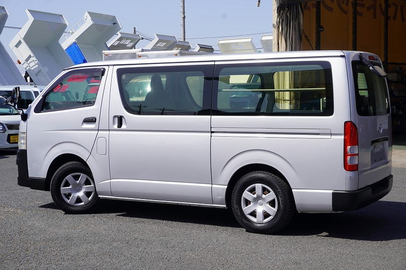 在庫No.C-0814 ハイエース ロング DX 5ドア ガソリン車 3人乗り トヨタ車体製パワーゲート 荷台板張り ラッシング1段 セパレーターカーテン 社外ナビ ETC キーレス AT車! 車検「R7年12月まで!」