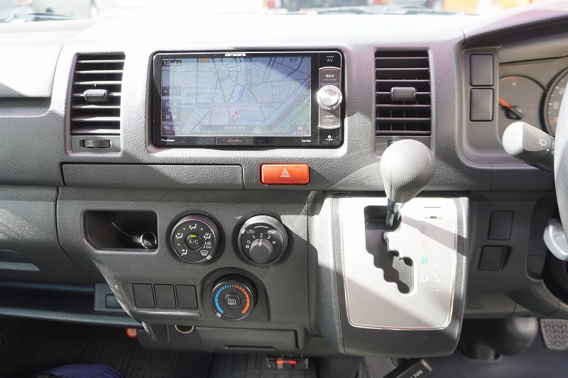 在庫No.K-0127 ハイエース ロング DX 5ドア 「ハイルーフ」 ガソリン車 3人乗り 和光工業製パワーゲート ラッシング1段 荷室加工有り 荷台板張り バックカメラ ETC 社外ナビ セパレーターカーテン 低走行!AT車!