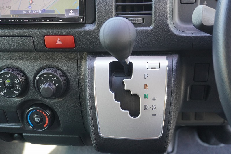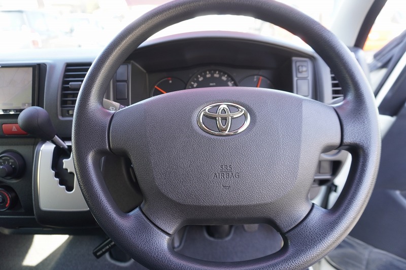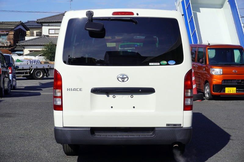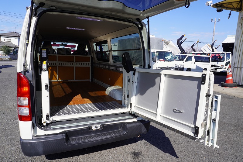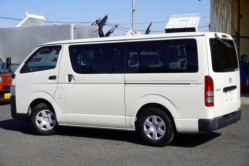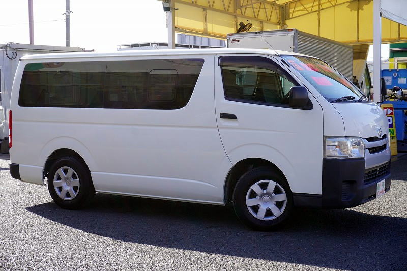 在庫No.K-0302 ハイエース ロング DX 4ドア ガソリン車 3人乗り トヨタ車体製パワーゲート 荷室加工有り 荷台板張り ラッシング1段 小窓 社外ナビ キーレス 低走行!AT車!