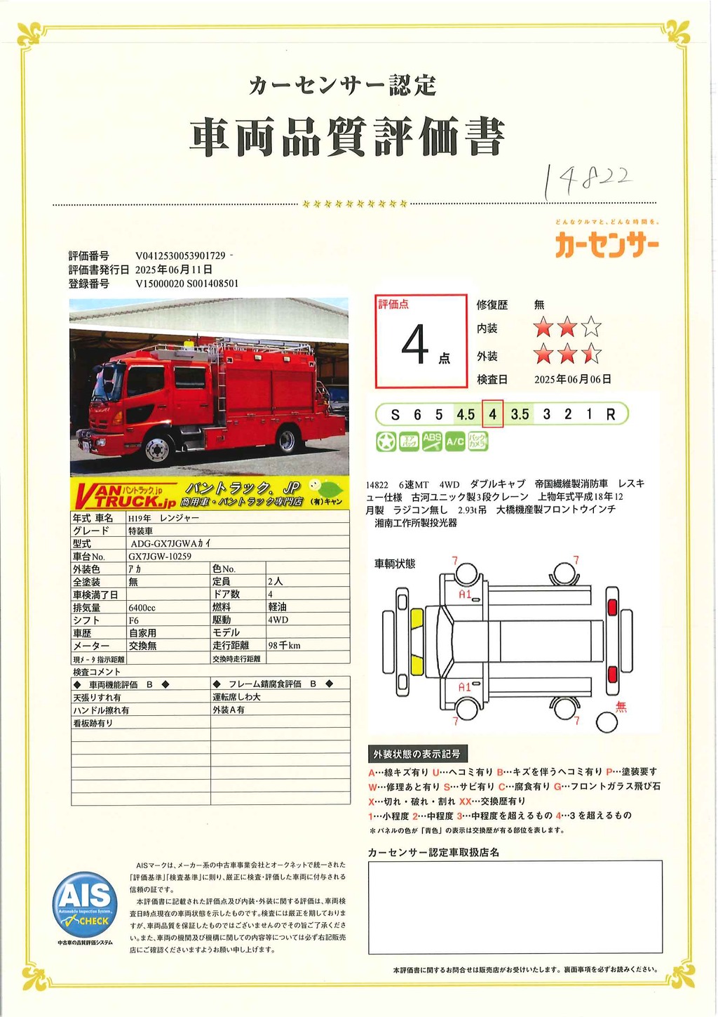 在庫No.C-0822 レンジャー 増トン ダブルキャブ 「4WD」 消防車 帝国繊維製 レスキュー仕様 古河ユニック製3段クレーン ラジコン無し フロントウインチ付 投光器 ピントルフック 牽引フック 上物上部シマ板張り 格納ステップ バックカメラ 坂道発進補助 アルミホイール 6速MT!