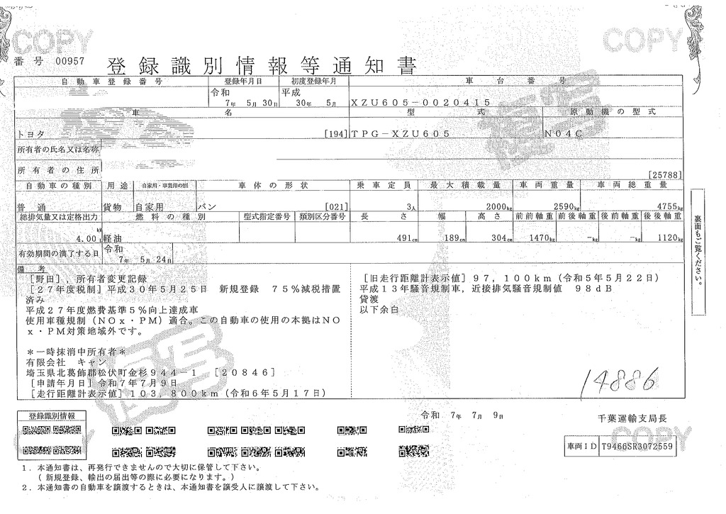 当店が把握できる車検証の表記より
