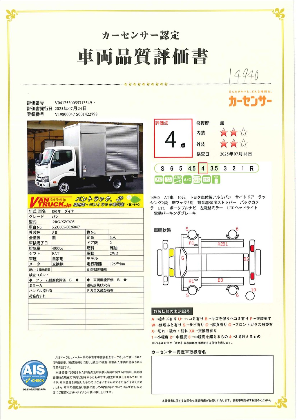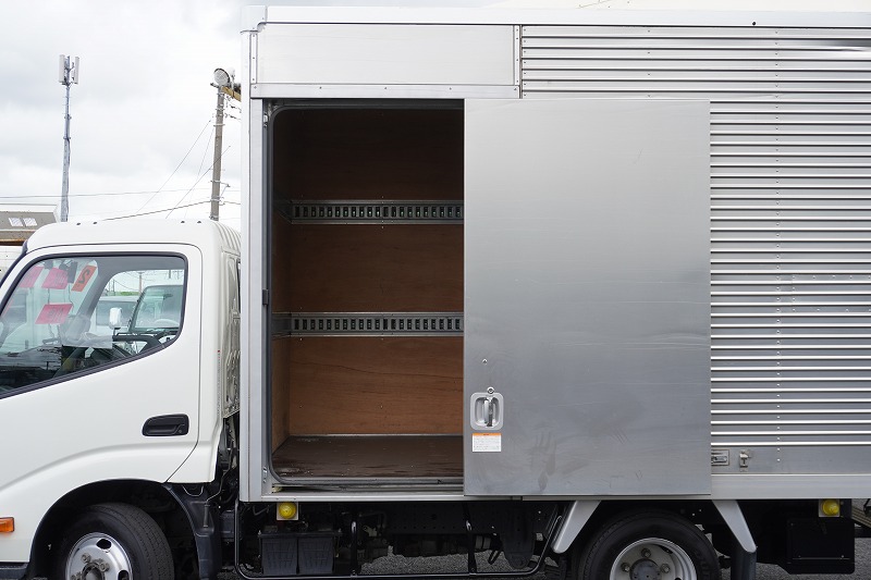 在庫No.C-0940 ダイナ 10尺 アルミバン 積載2000kg サイドドア ラッシング2段 床フック3対 90度ストッパー バックカメラ ETC 左電格ミラー LEDヘッドライト スマートキー 電動パーキングブレーキ トヨタ車体製 ワンオーナー!AT車!