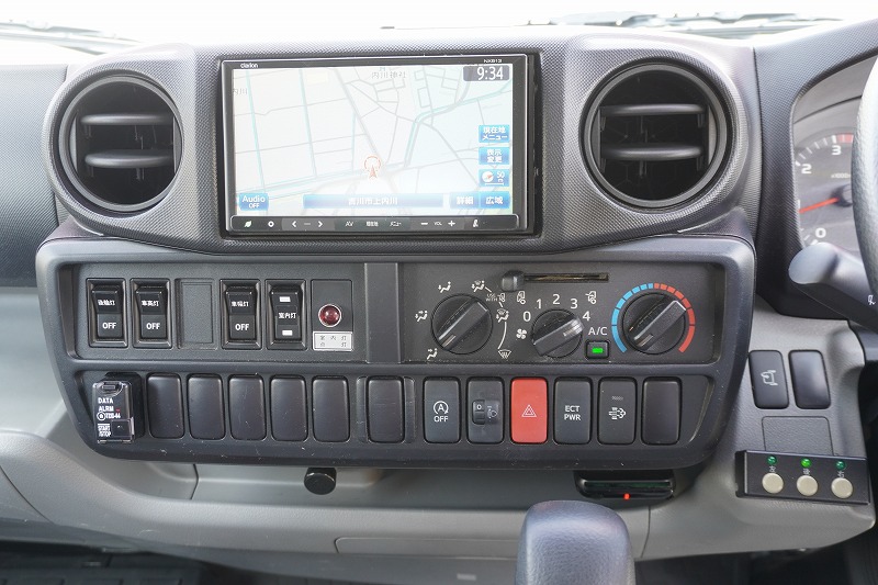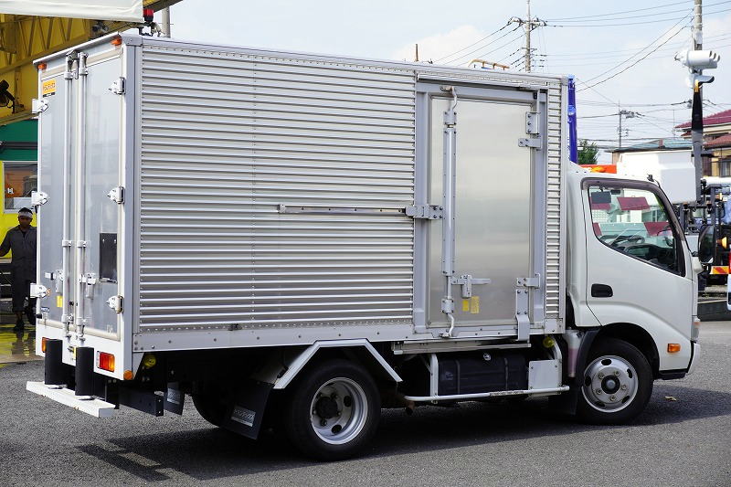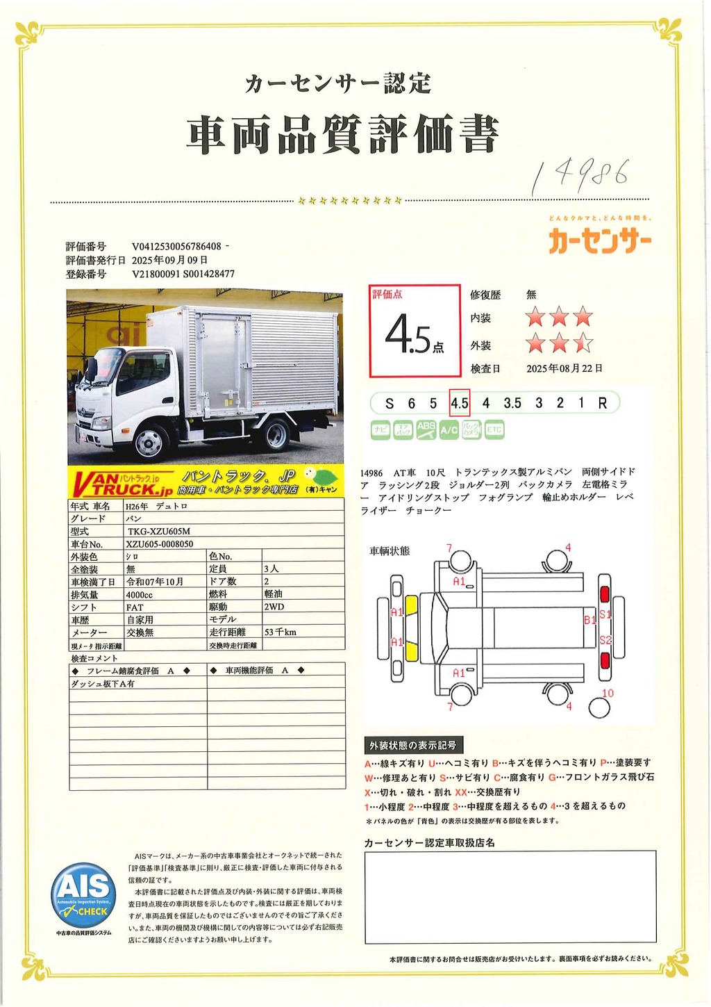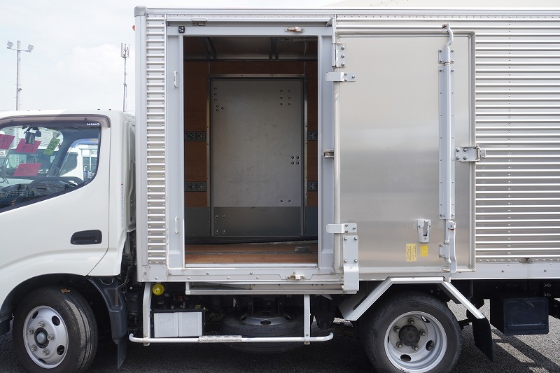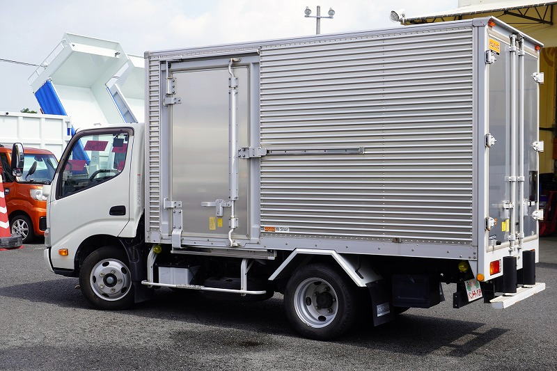 在庫No.C-0986 デュトロ 10尺 アルミバン 積載2950kg 両側サイドドア ラッシング2段 ジョルダー2列 バックカメラ 社外ナビ ETC 左電格ミラー フォグランプ トランテックス製 AT車!