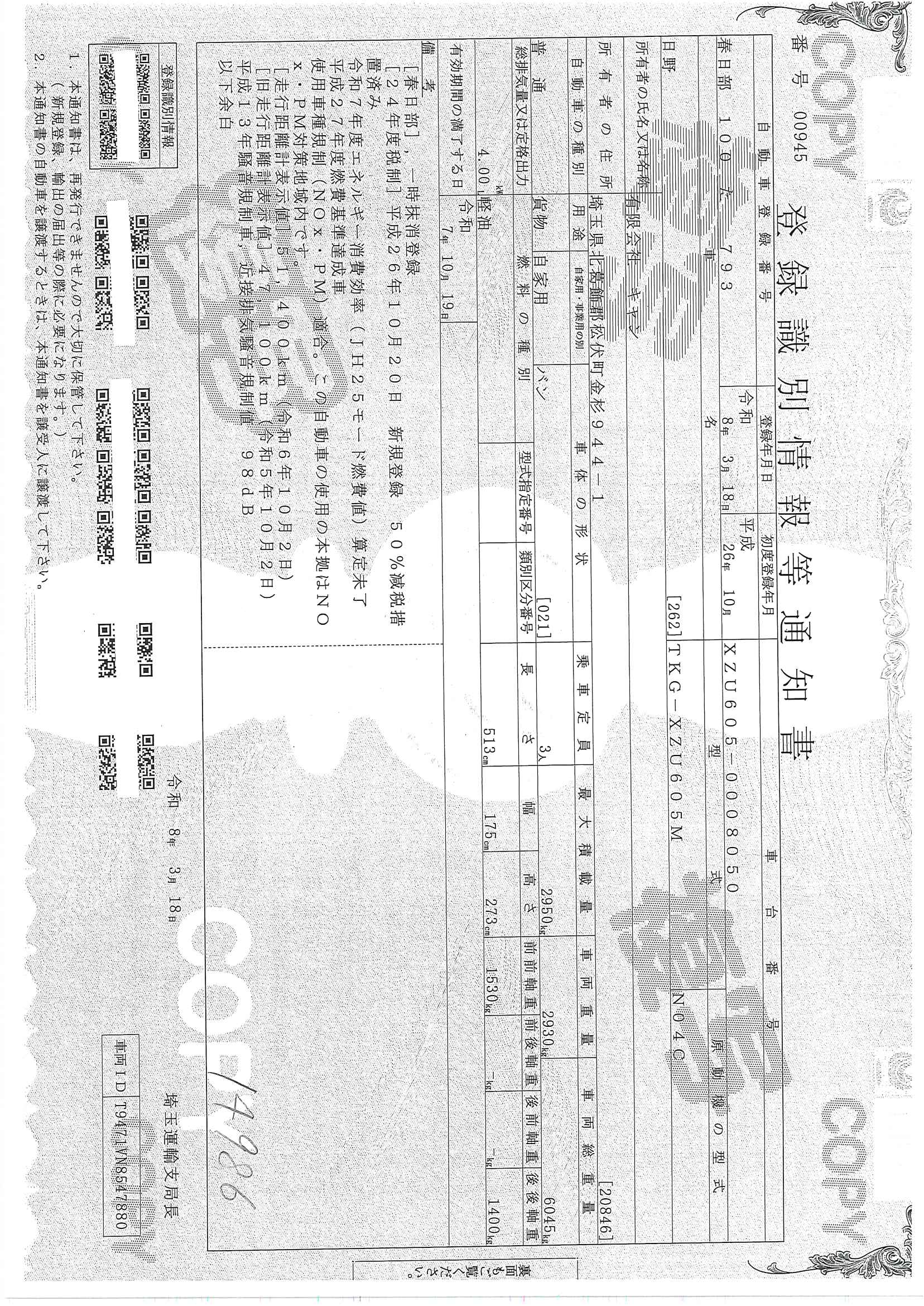 当店が把握できる車検証の表記より