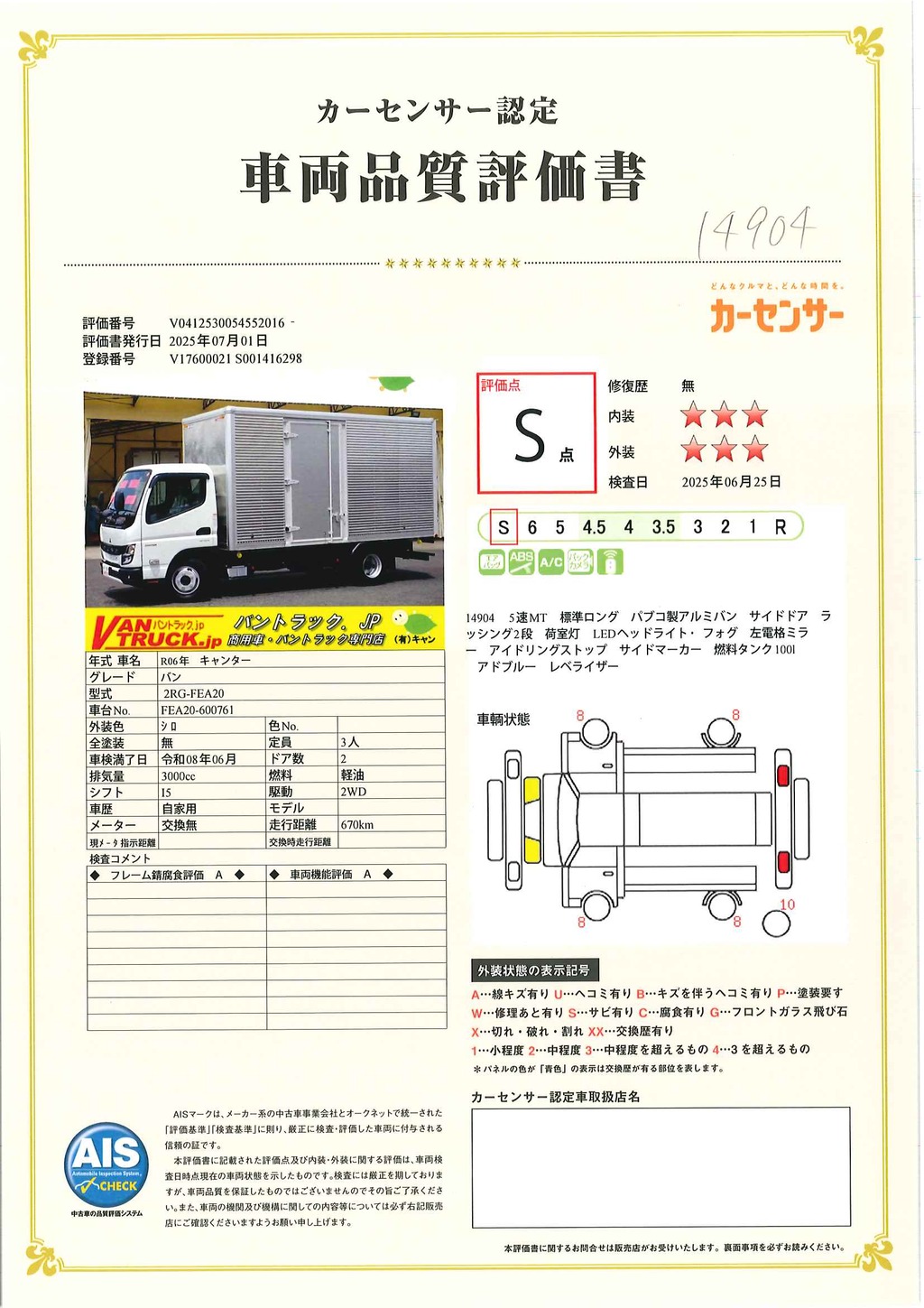 在庫No.C-0904 (未使用) キャンター 「標準幅 ロング」 アルミバン 積載2000kg サイドドア ラッシング2段 バックカメラ 左電格ミラー スマートキー LEDヘッドライト&フォグランプ パブコ製 全高約3m 衝突軽減ブレーキ 車線逸脱警報 5速MT!準中型(5トン限定)免許対応! 車検「R8年6月まで!」