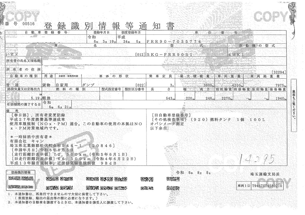 4t 寝台無し 強化ダンプ 1方開 3.6トン積 手動シート 鳥居補強 社外リヤバンパー |