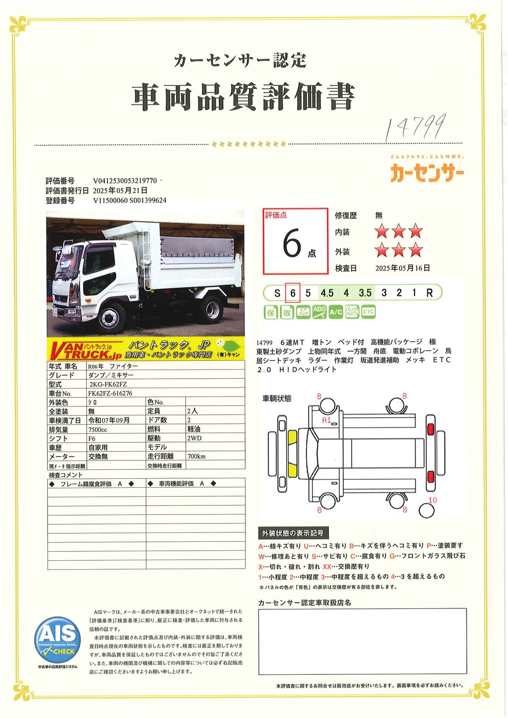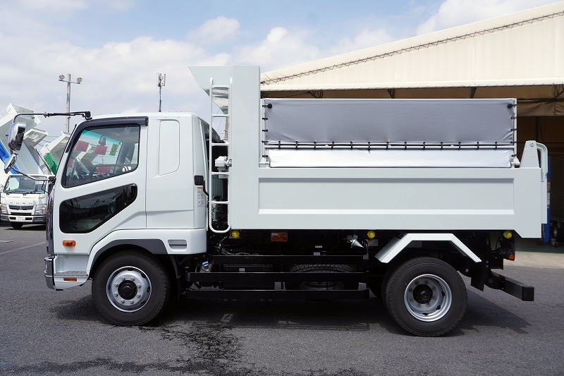 在庫No.C-0799 (未使用) ファイター 増トン 「ベッド付き」 土砂ダンプ 極東製 一方開 舟底 積載7600kg 電動コボレーン 鳥居シートデッキ&ラダー バックカメラ ETC2.0 坂道発進補助 衝突軽減ブレーキ 車線逸脱警報 メッキパーツ 高機能パッケージ!6速MT!車検「R7年9月まで!」