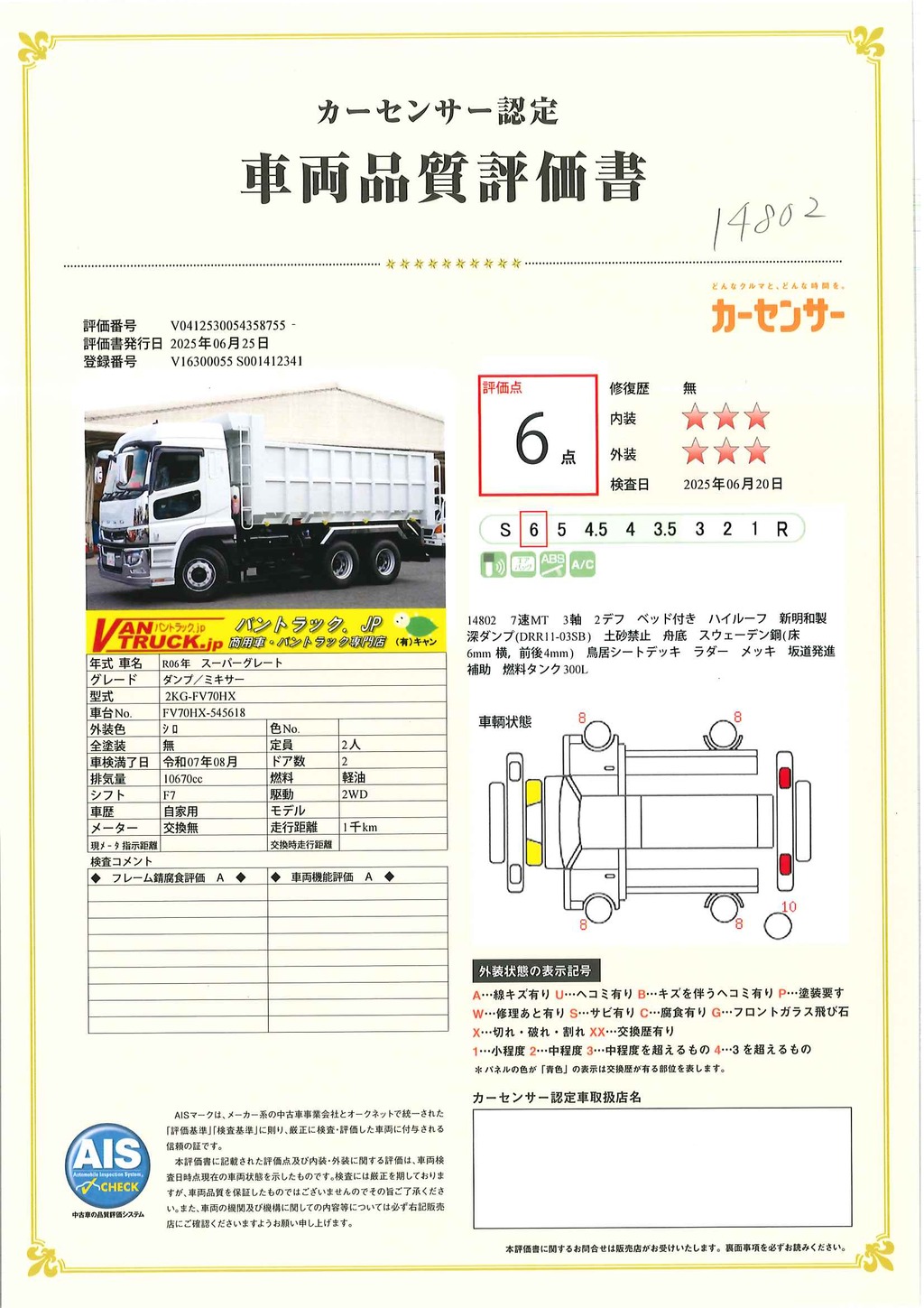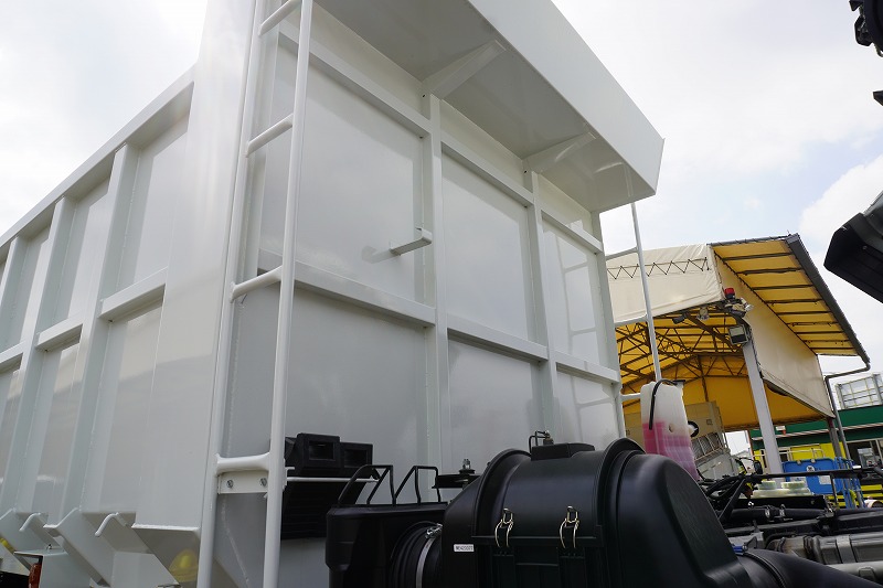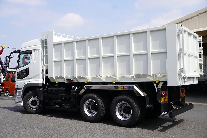 在庫No.C-0802 (未使用) スーパーグレート 大型 3軸 2デフ 深ダンプ 「ハイルーフ 土砂禁止」 5.3m長 積載8300kg 新明和製 舟底 鳥居シートデッキ&ラダー リア横開き扉 メッキパーツ 7速MT!総重量20トン未満!