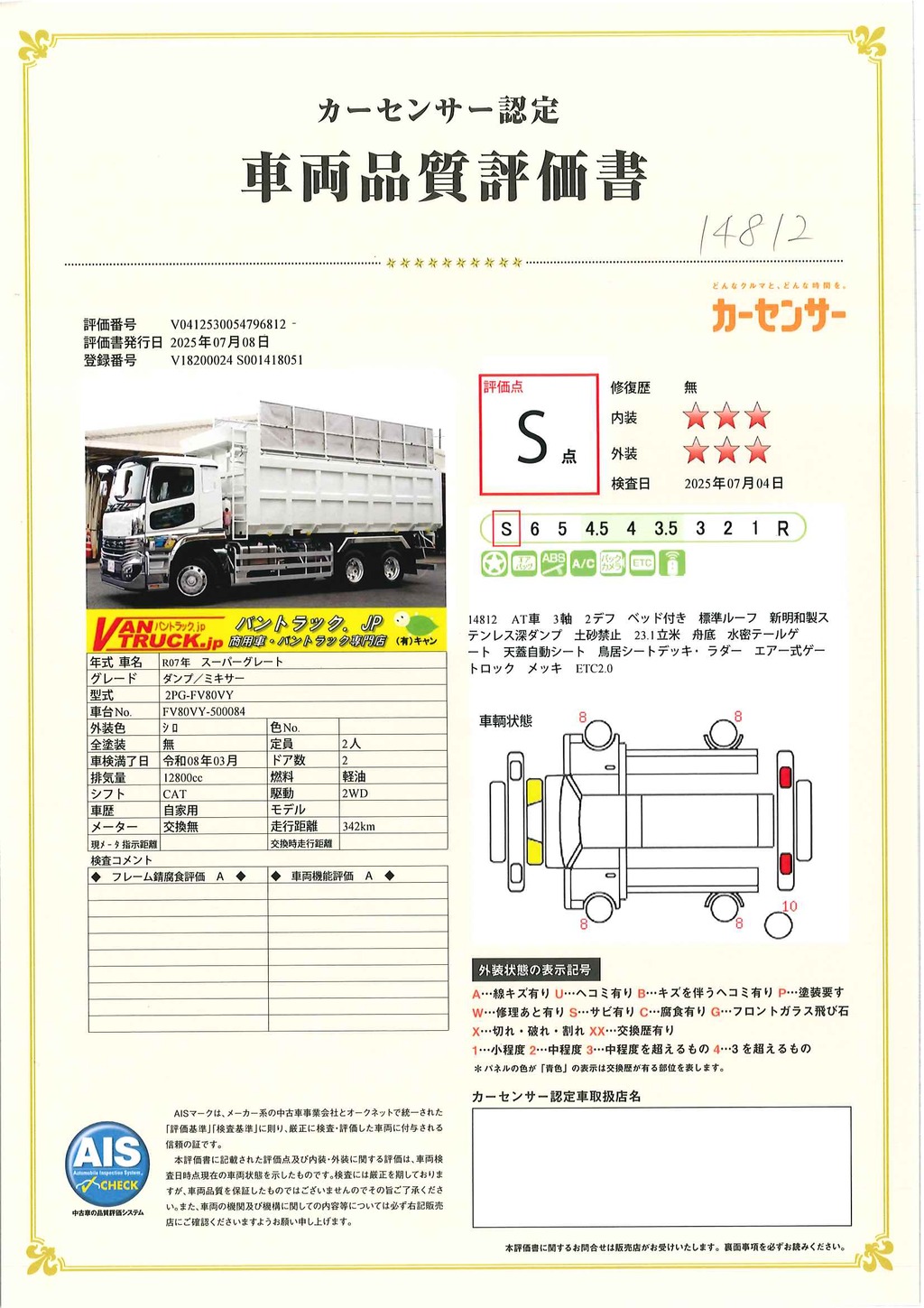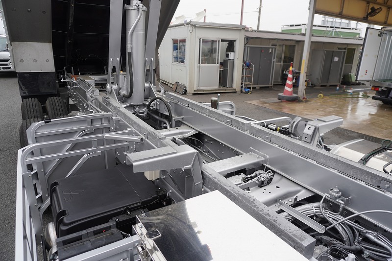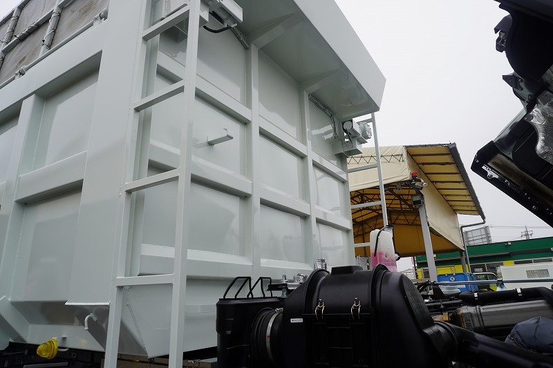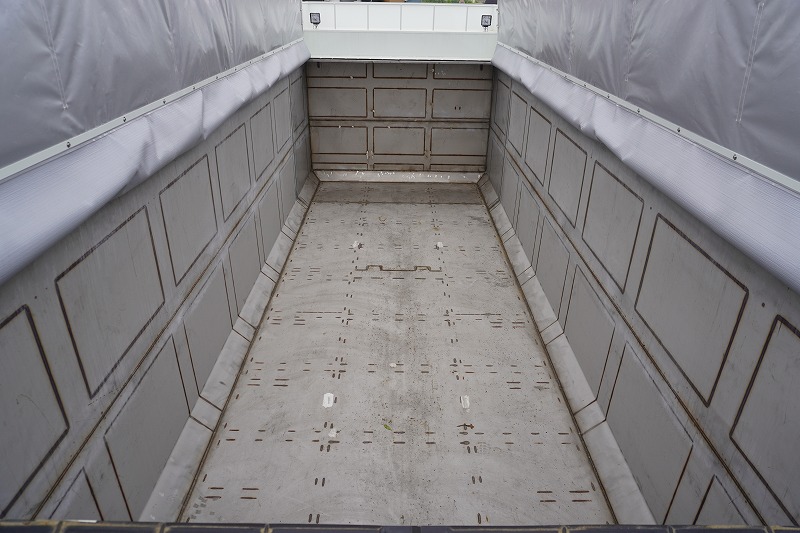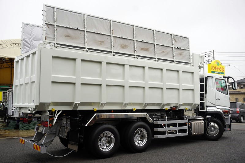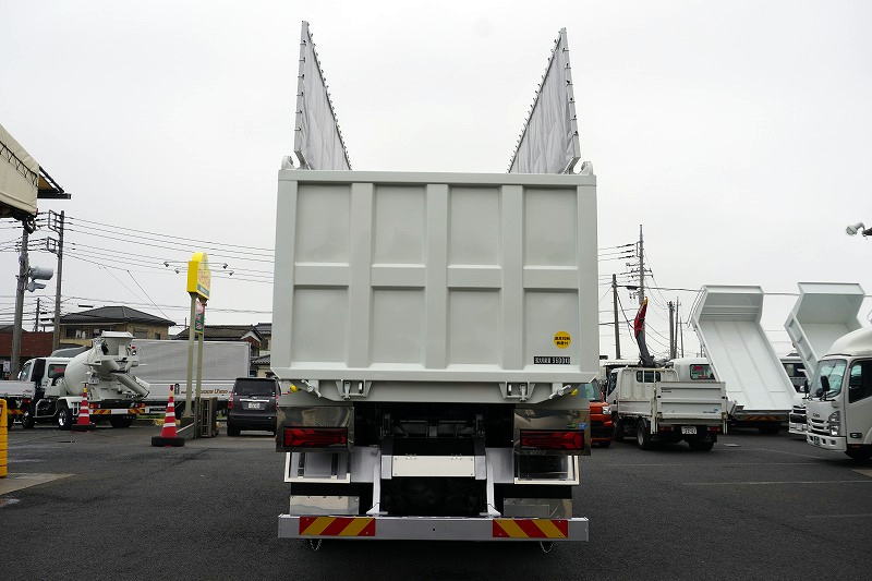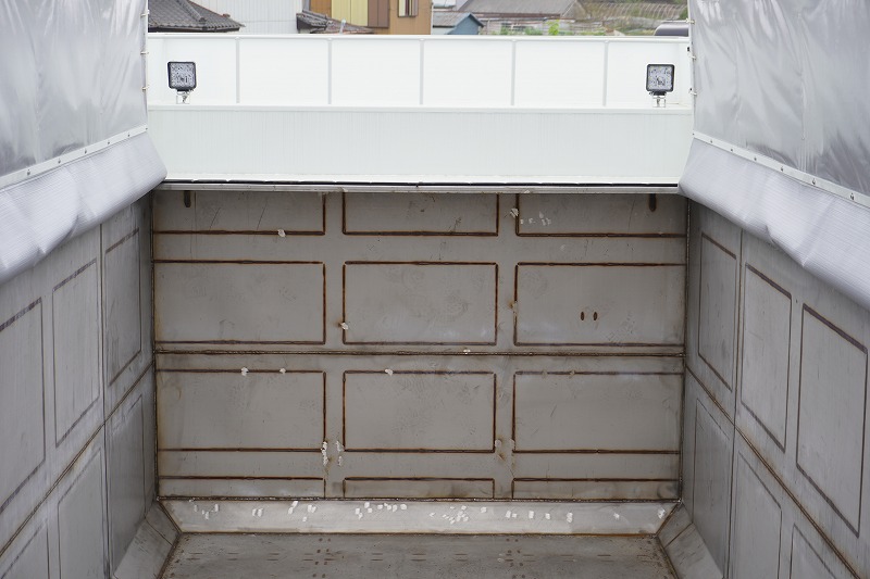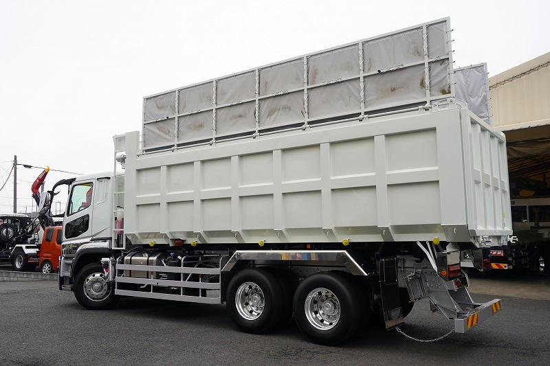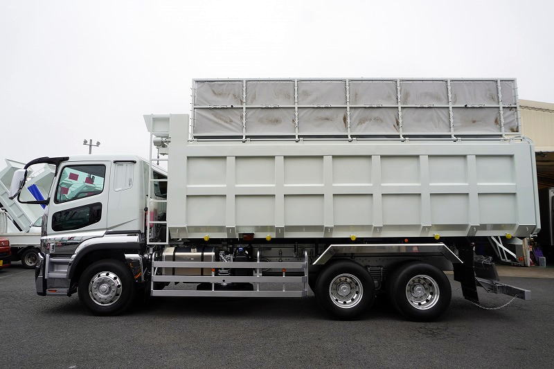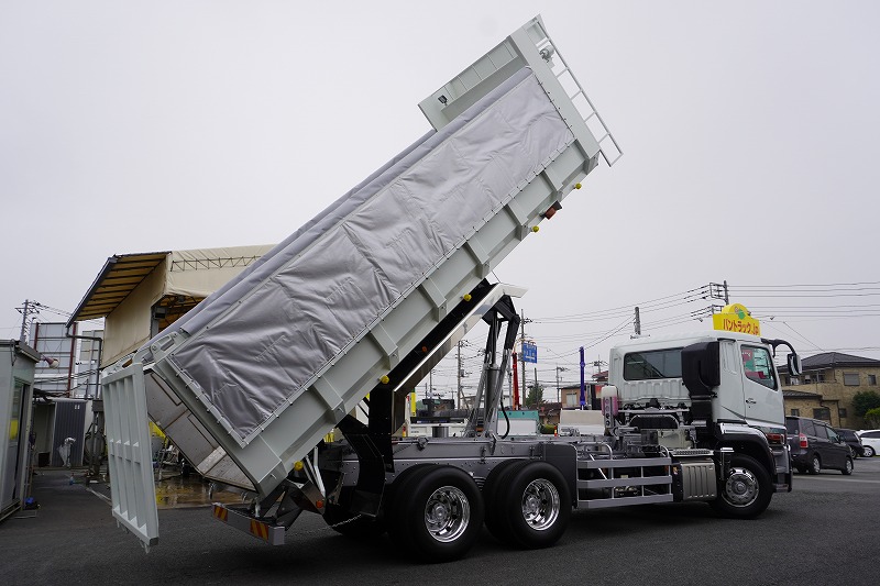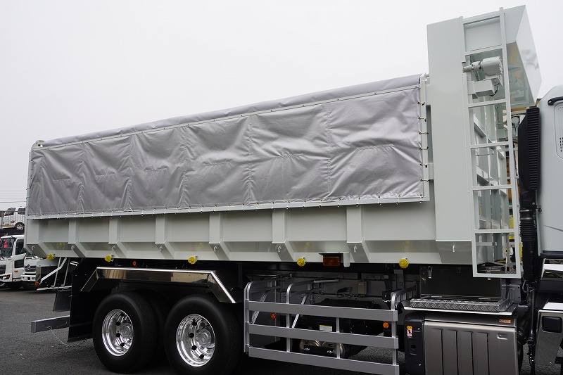 在庫No.C-0812 (未使用) スーパーグレート 大型 3軸 2デフ ステンレス深ダンプ 「土砂禁止」 6.5m長 23.1立米 積載9600kg 新明和製 舟底 水密テールゲート 天蓋自動シート エアー式ゲートロック 鳥居シートデッキ&ラダー シャーシシルバー塗装 バックカメラ アルミホイール メッキパーツ AT車!新型! 車検「R8年3月まで!」