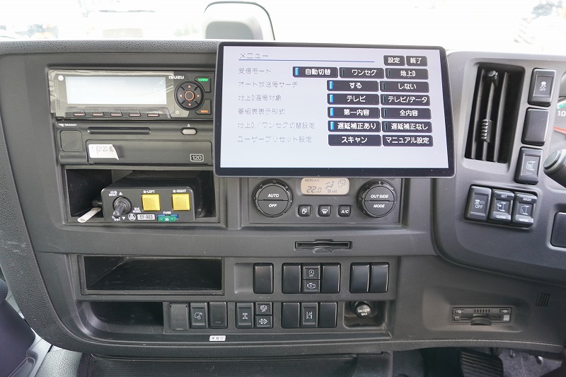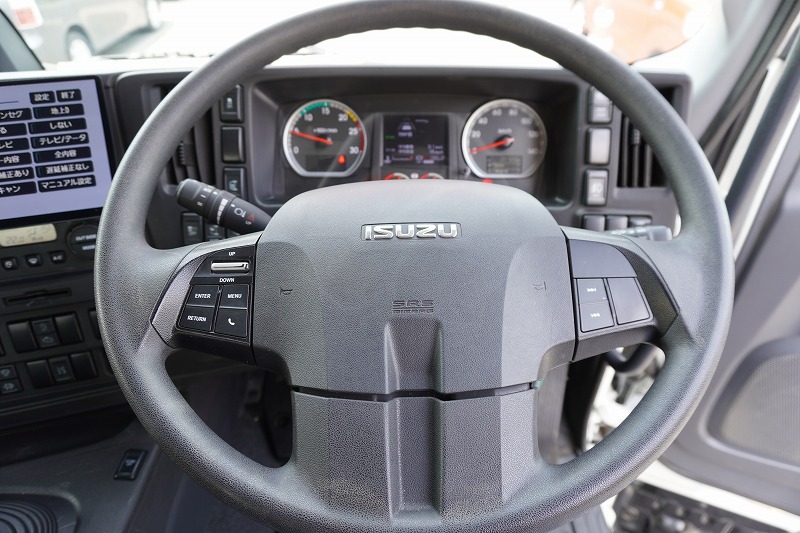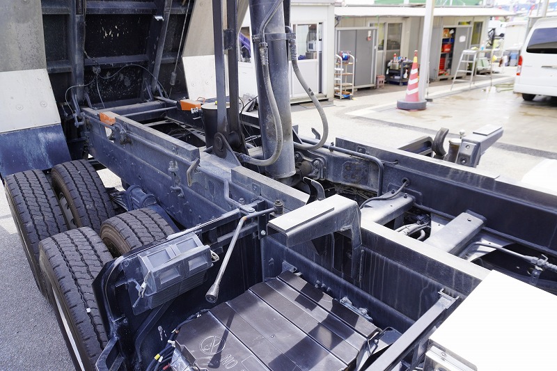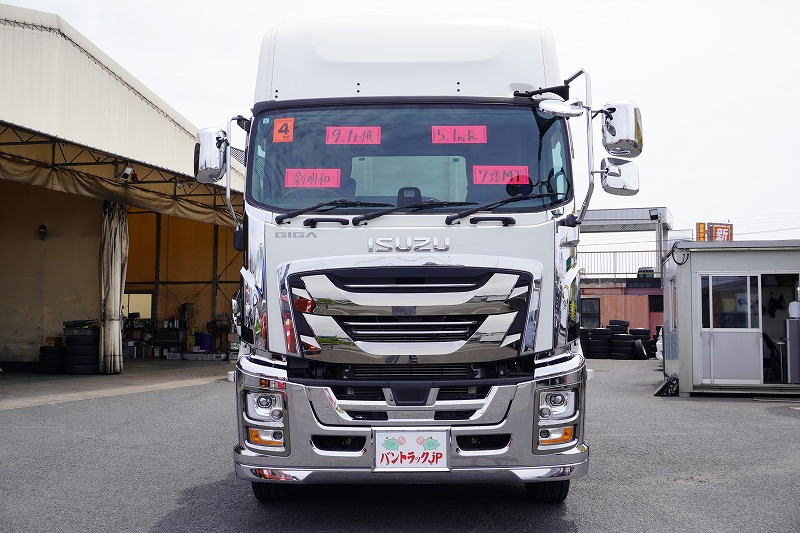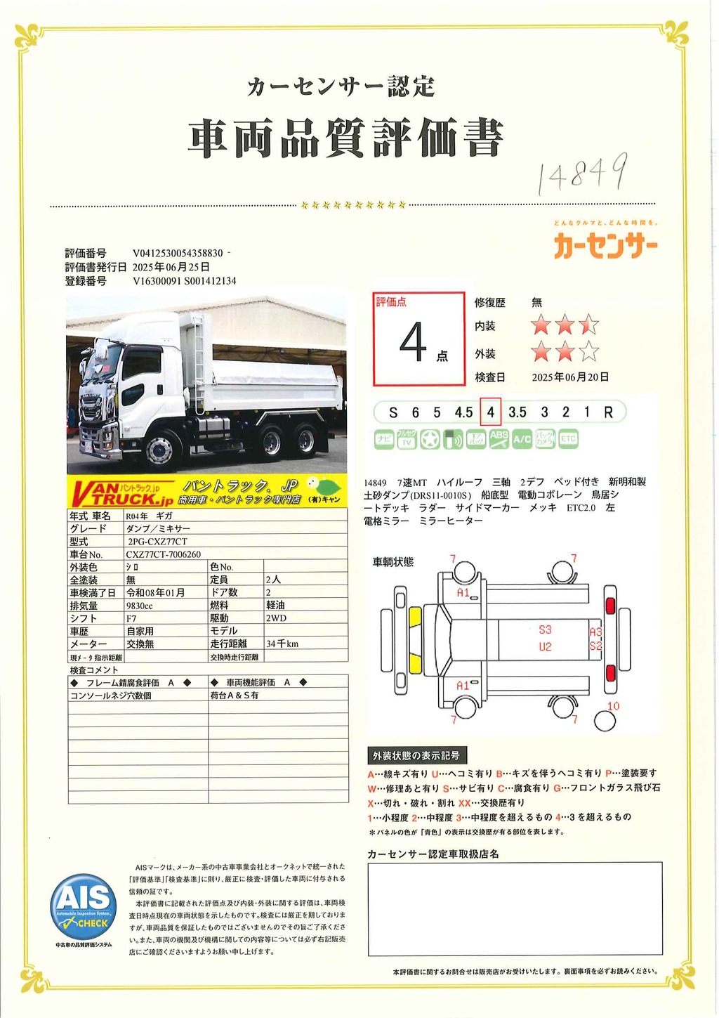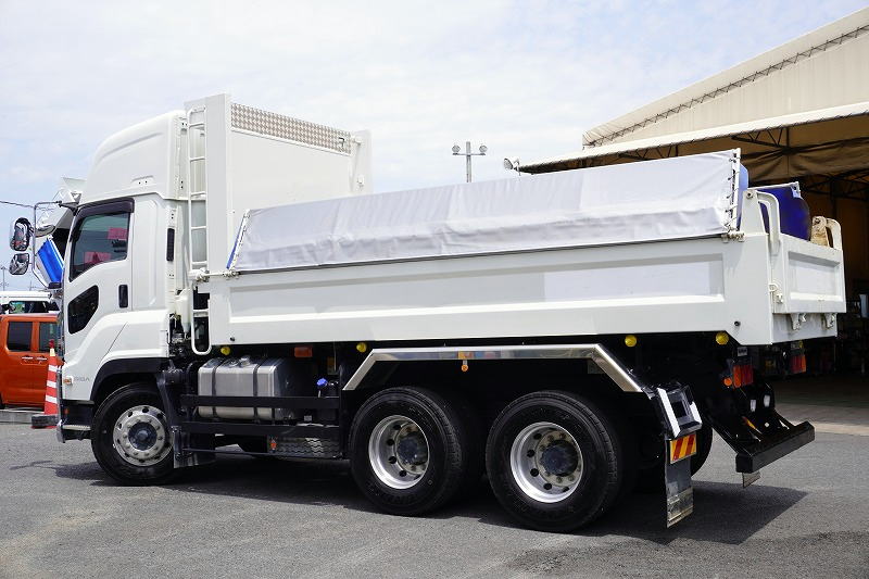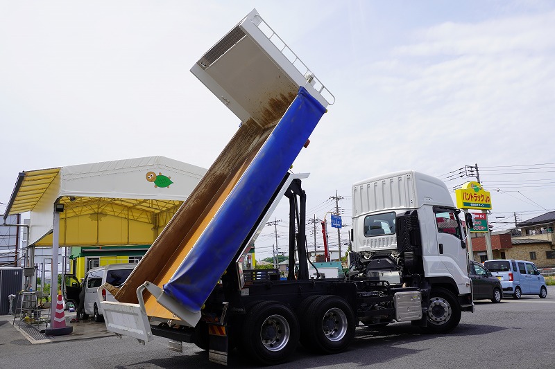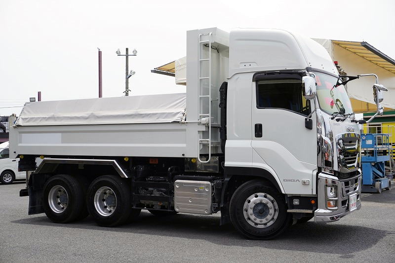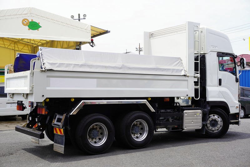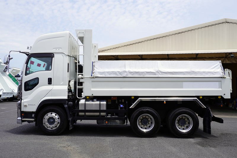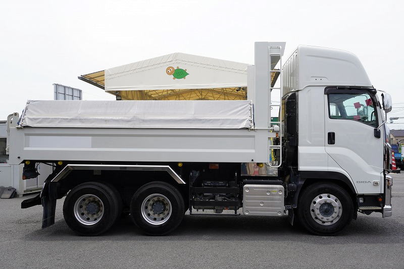 在庫No.C-0849 ギガ 大型 「ハイルーフ」 3軸 2デフ 土砂ダンプ 5.1m長 積載9100kg 新明和製 船底型 電動コボレーン 鳥居シートデッキ&ラダー 燃料タンク300L メッキパーツ アルミホイール 社外ナビ フルセグTV バックカメラ ETC2.0 LEDヘッドライト 保冷庫 ミラーワイパー 7速MT!高年式!総重量20トン未満! 車検「R8年1月まで!」