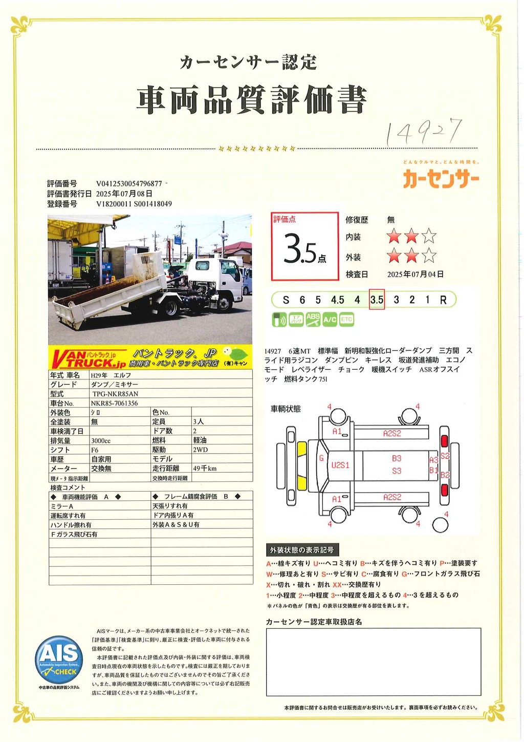 在庫No.C-0927 エルフ 「標準幅」 強化 ローダーダンプ 新明和製 三方開 積載3000kg スライド用ラジコン ダンプピン ETC 坂道発進補助 キーレス 6速MT!