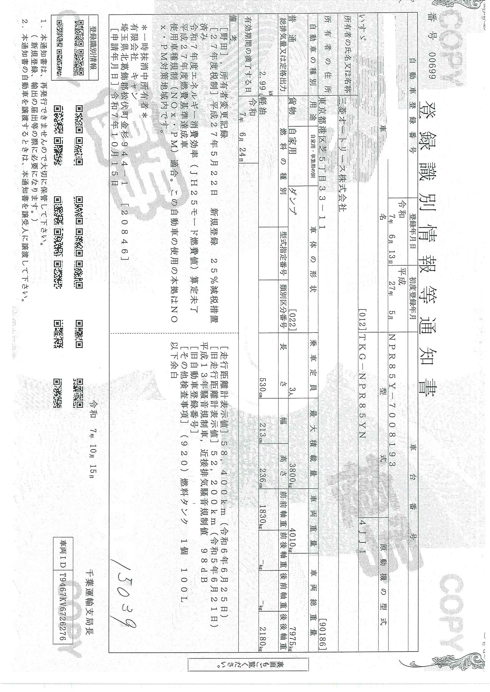 当店が把握できる車検証の表記より