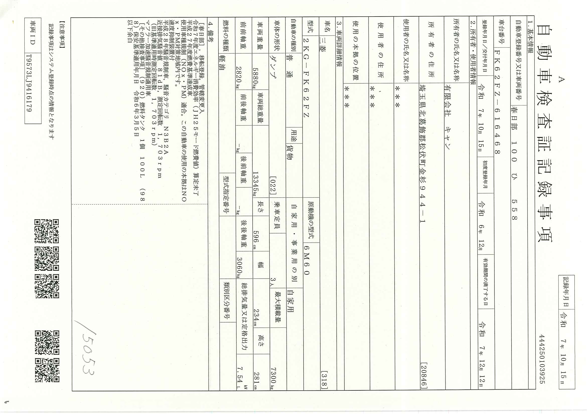 当店が把握できる車検証の表記より