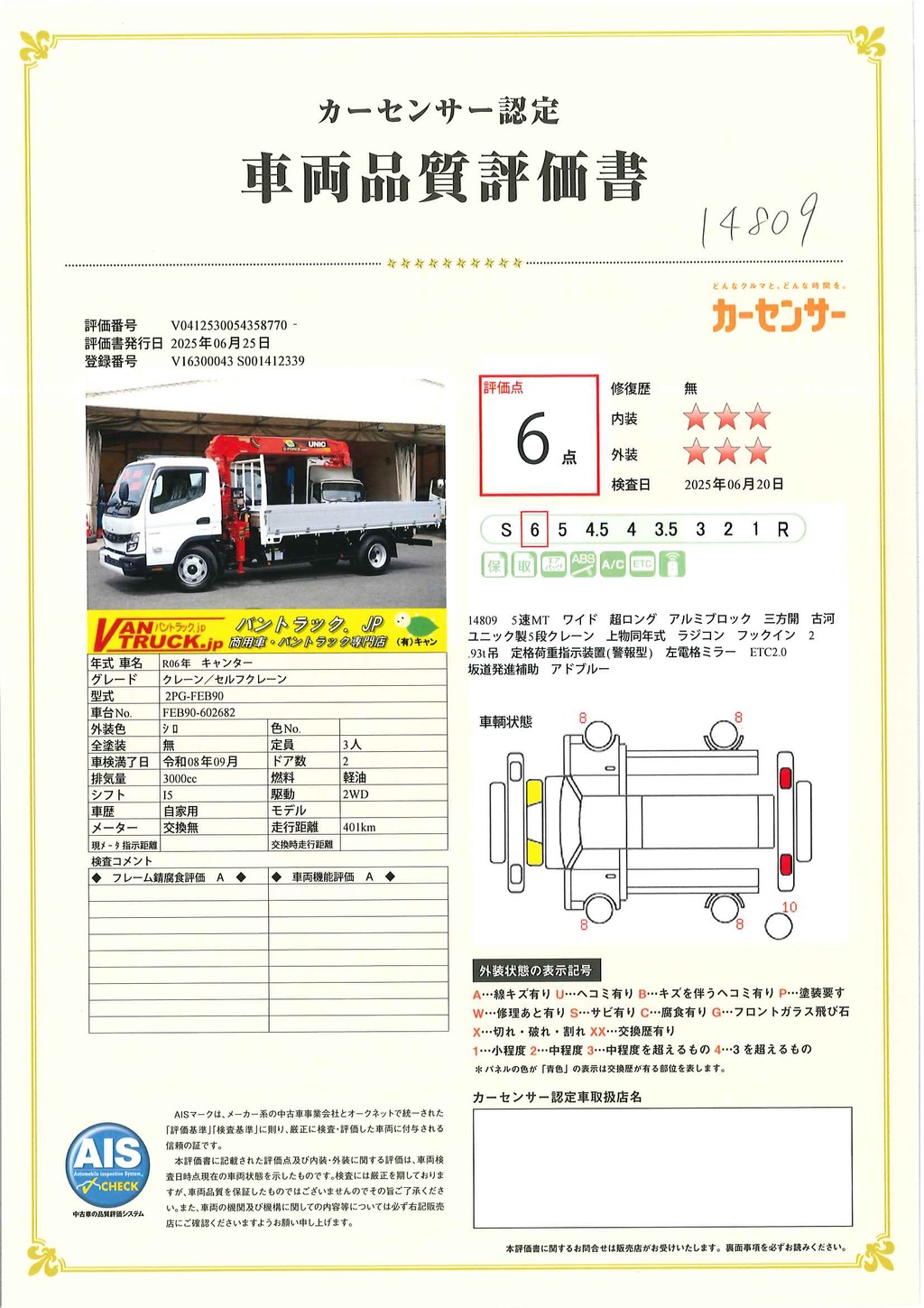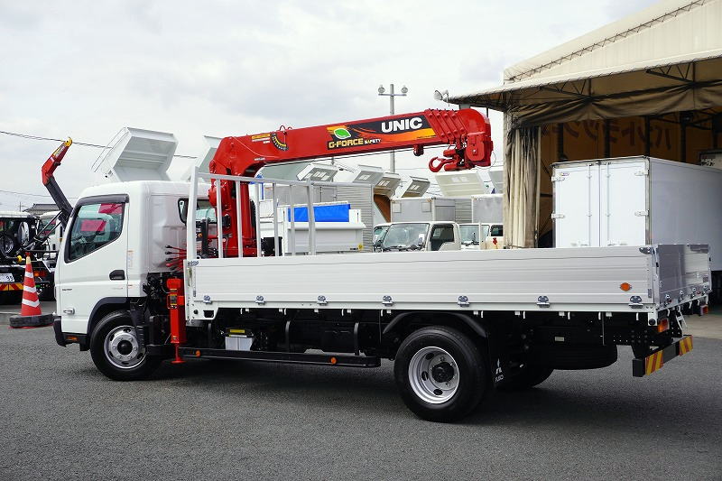 在庫No.C-0809 (未使用) キャンター 「ワイド超ロング」 5段クレーン 積載3750kg アルミブロック 古河ユニック製 ラジコン フックイン 2.93t吊 ETC2.0 左電格ミラー LEDヘッドライト&フォグランプ スマートキー 衝突軽減ブレーキ 車線逸脱警報 5速MT! 車検「R8年9月まで!」
