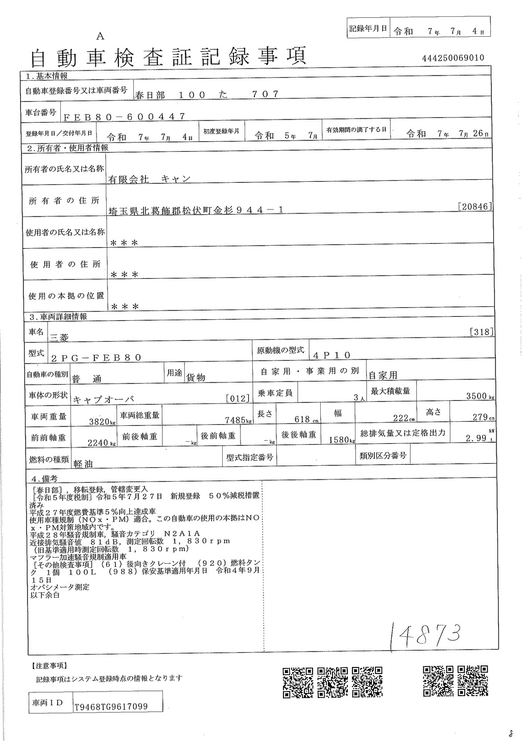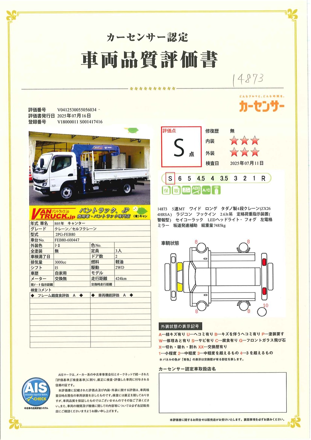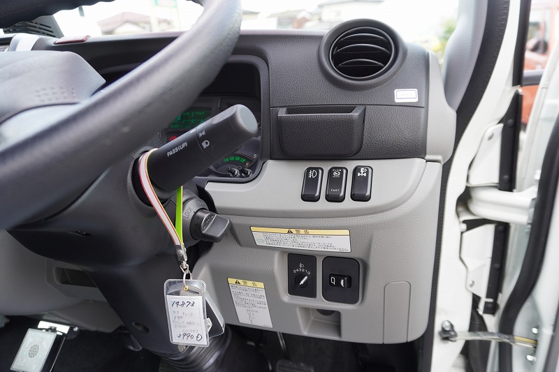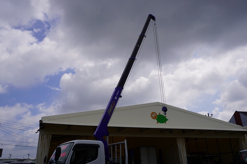 在庫No.C-0873 (未使用) キャンター 「ワイドロング」 4段クレーン 積載3500kg タダノ製 ラジコン フックイン 2.63t吊 セイコーラック LEDヘッドライト&LEDフォグランプ 左電格ミラー 坂道発進補助 スマートキー 衝突軽減ブレーキ 車線逸脱警報 5速MT!
