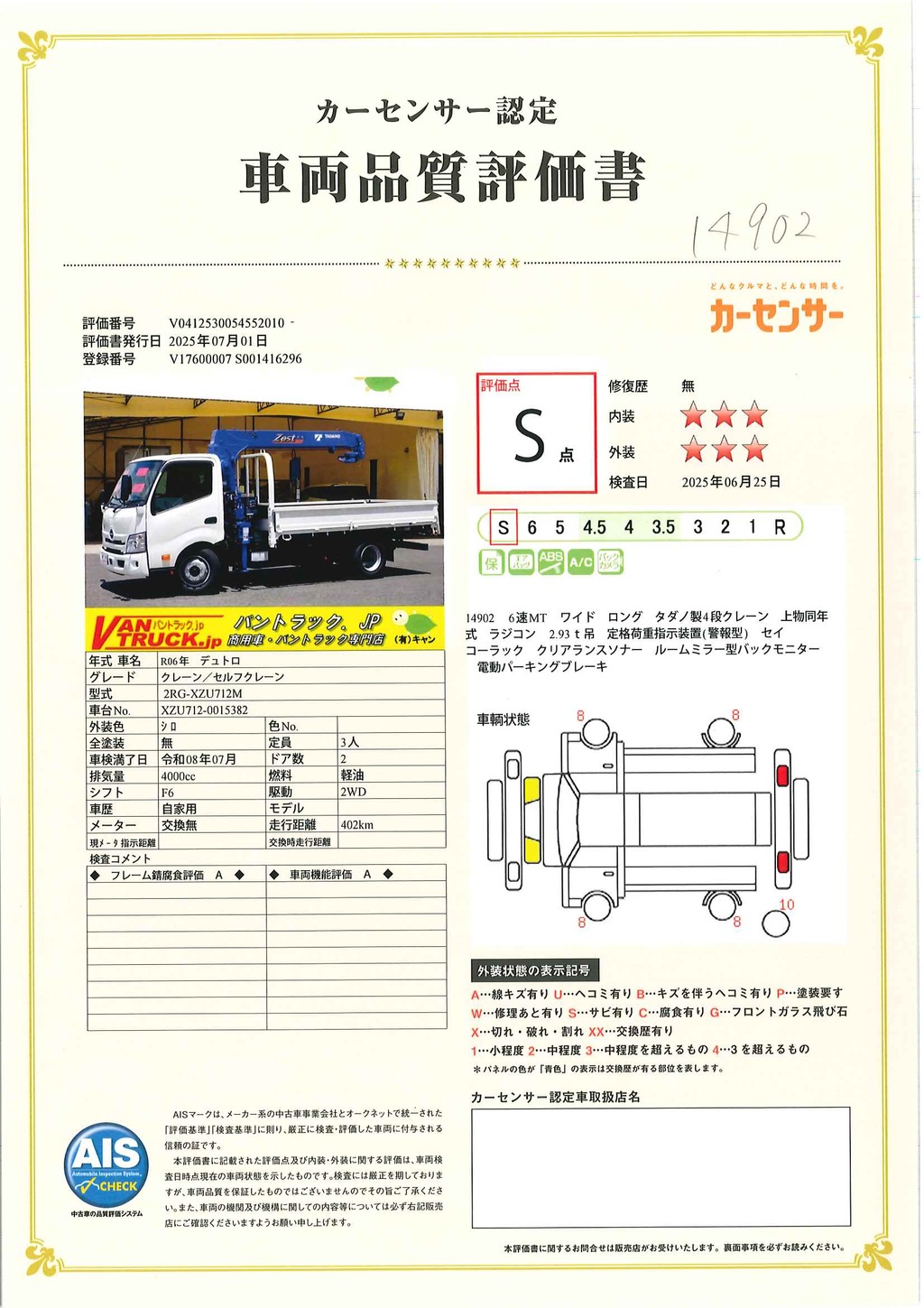在庫No.C-0902 (未使用) デュトロ 「ワイドロング」 4段クレーン 積載3000kg タダノ製 ラジコン フックイン 2.93t吊 セイコーラック LEDヘッドライト フォグランプ クリアランスソナー 左電格ミラー ルームミラー型バックカメラ 電動パーキングブレーキ 衝突軽減ブレーキ 車線逸脱警報 6速MT!車検「R8年7月まで!」
