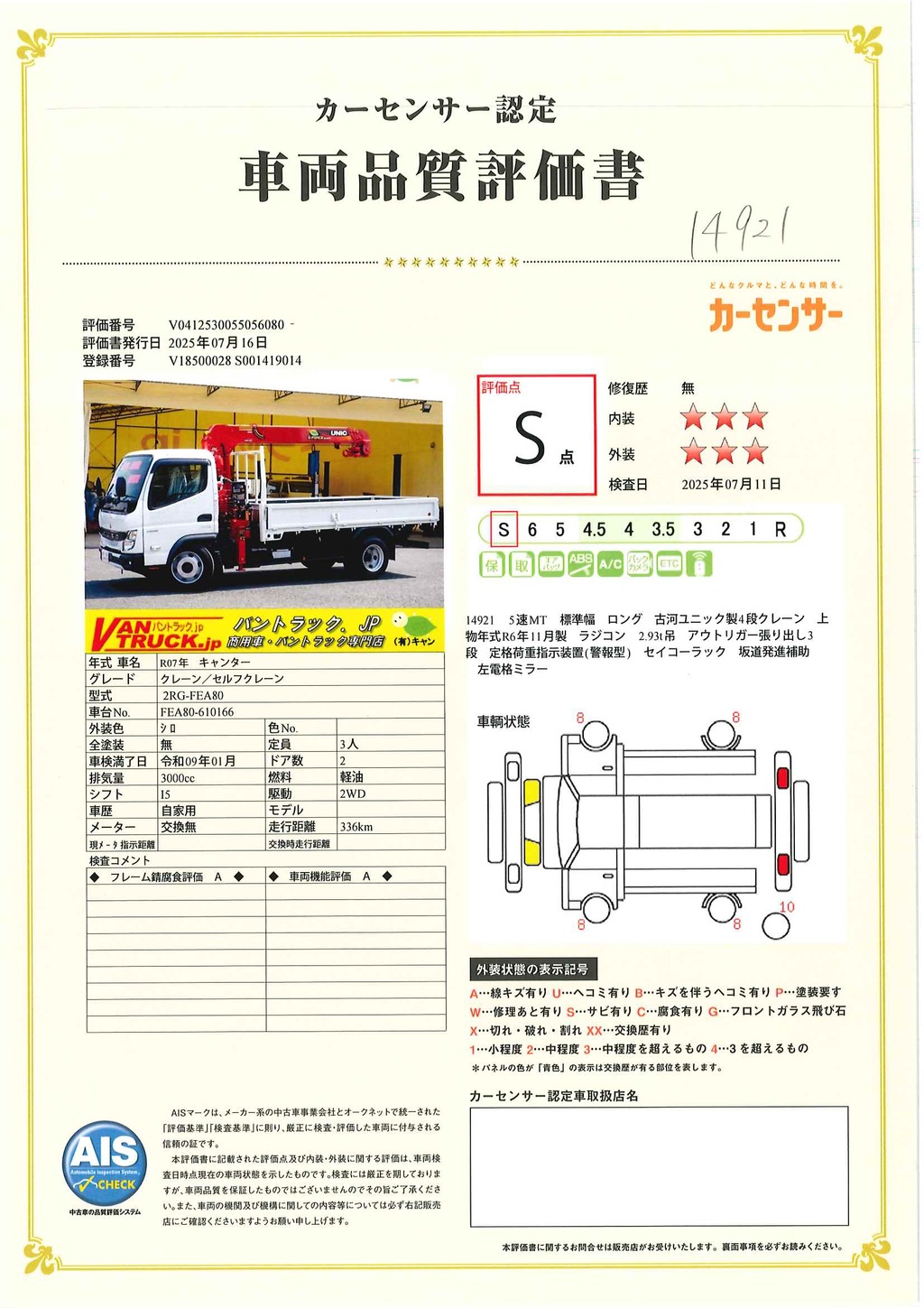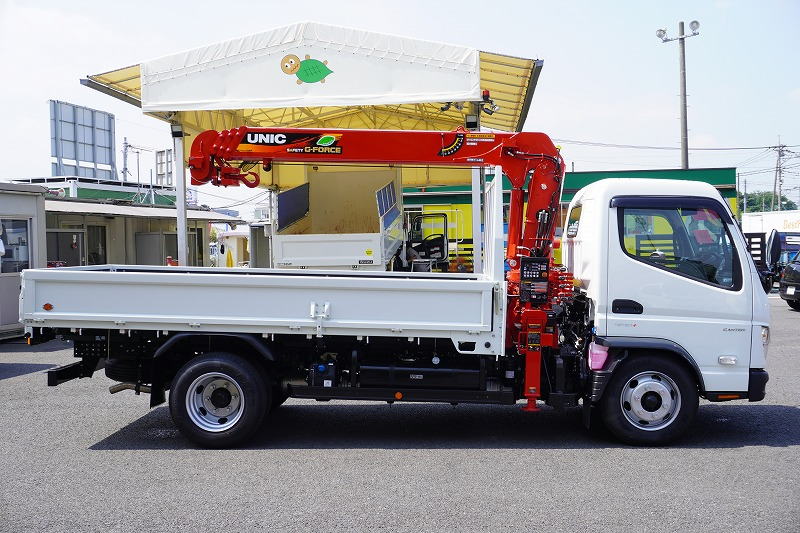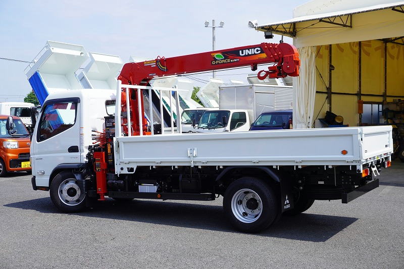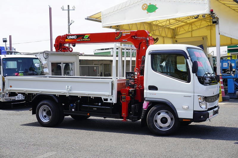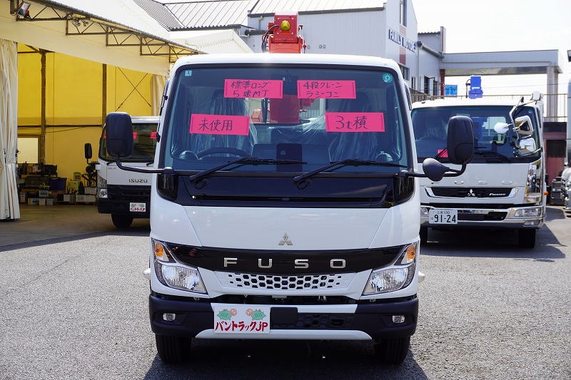 在庫No.C-0921 (未使用) キャンター 「標準幅 ロング」 4段クレーン 積載3000kg 古河ユニック製 ラジコン フックイン 2.93t吊 セイコーラック 左電格ミラー 坂道発進補助 バックカメラ ETC フォグランプ スマートキー 衝突軽減ブレーキ 車線逸脱警報 5速MT! 車検「R9年1月まで!」