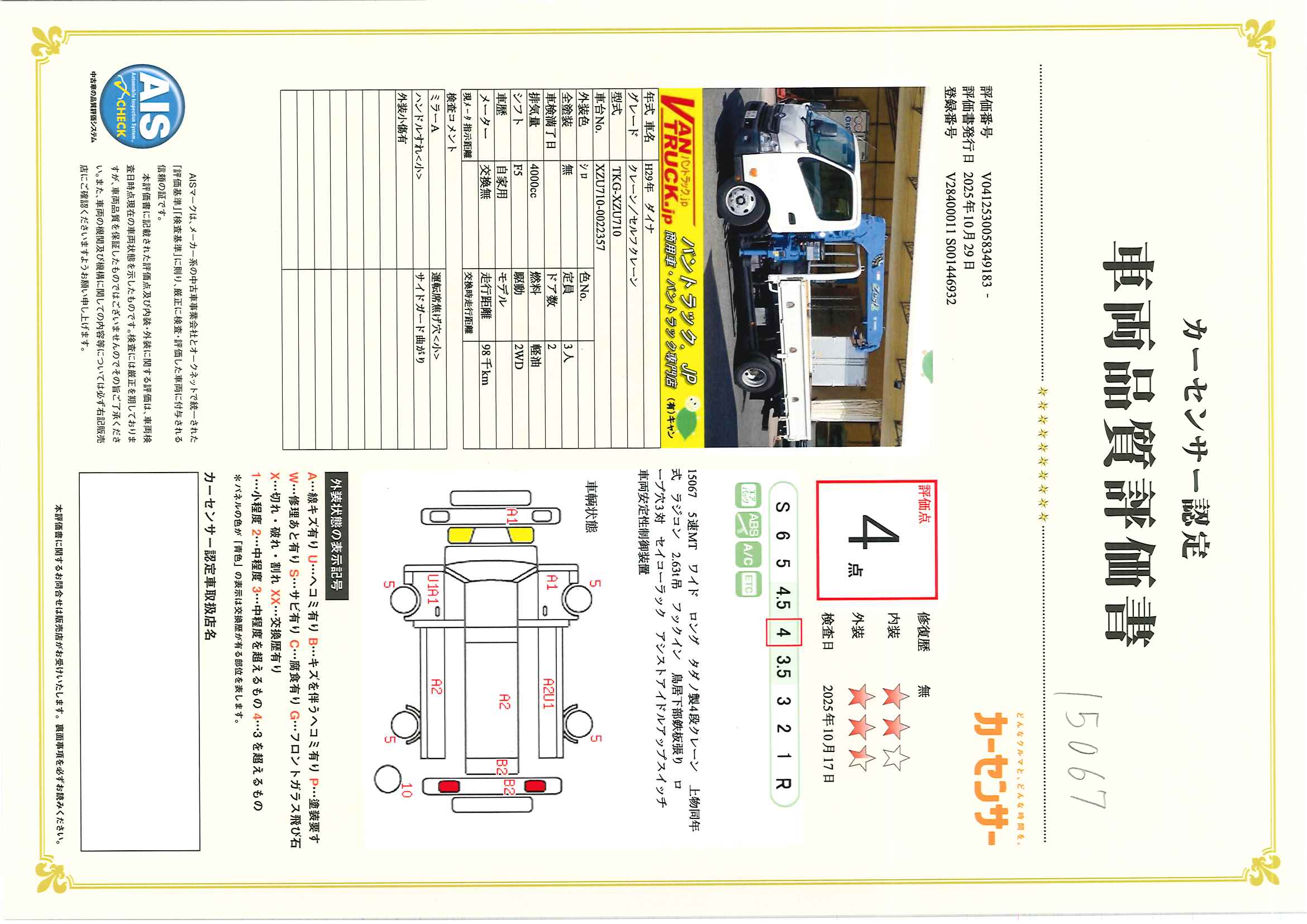 在庫No.K-0067 ダイナ 「ワイドロング」 4段クレーン 積載2000kg タダノ製 ラジコン フックイン 2.63t吊 セイコーラック 鳥居下部鉄板張り ロープ穴3対 ETC 5速MT!