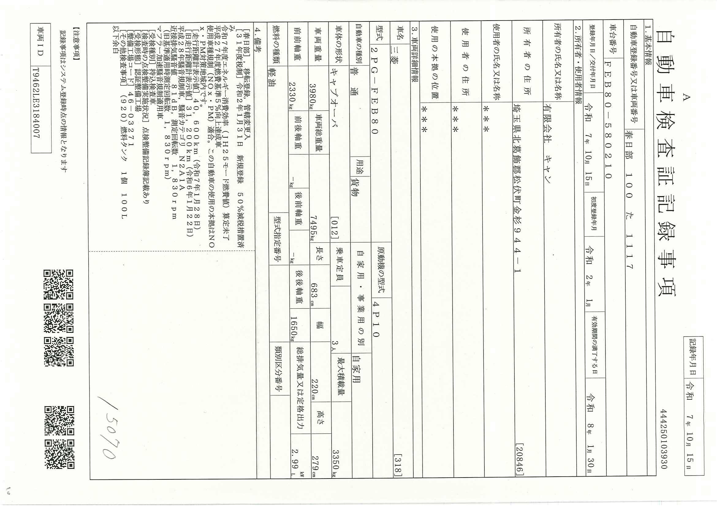 当店が把握できる車検証の表記より