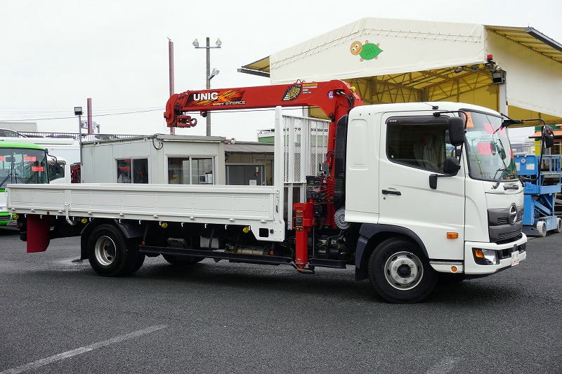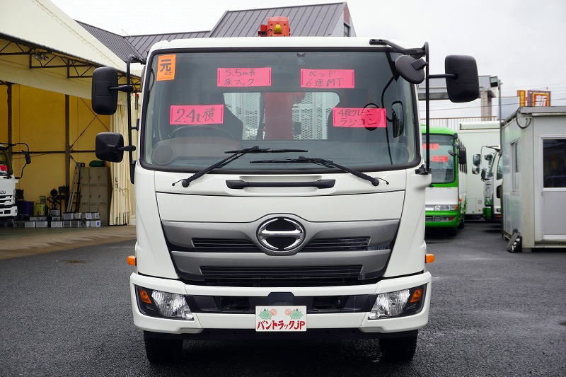 在庫No.K-0105 レンジャー 4トン 「標準幅 ベッド付き」 4段クレーン 積載2400kg 古河ユニック製 ラジコン フックイン 2.93t吊 5.5m長 床フック4対 セイコーラック 鳥居金網張り&下部鉄板張り 坂道発進補助 ETC 6速MT!
