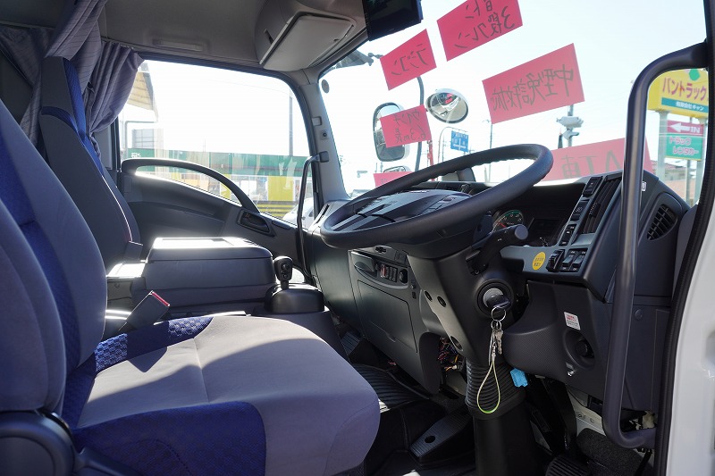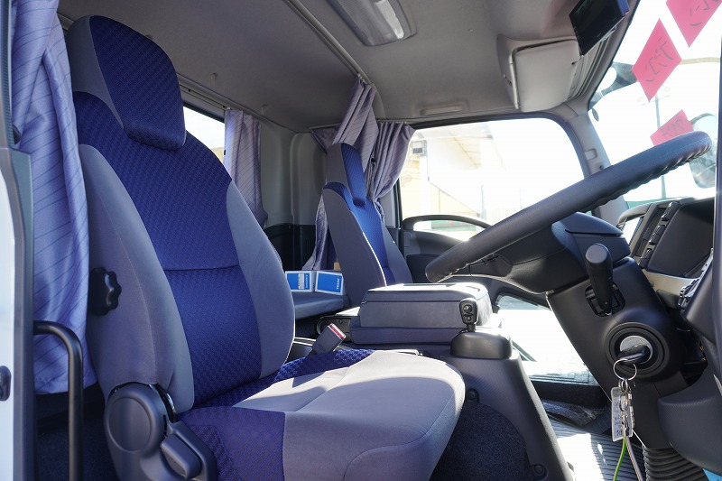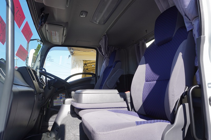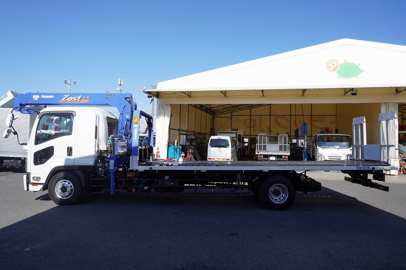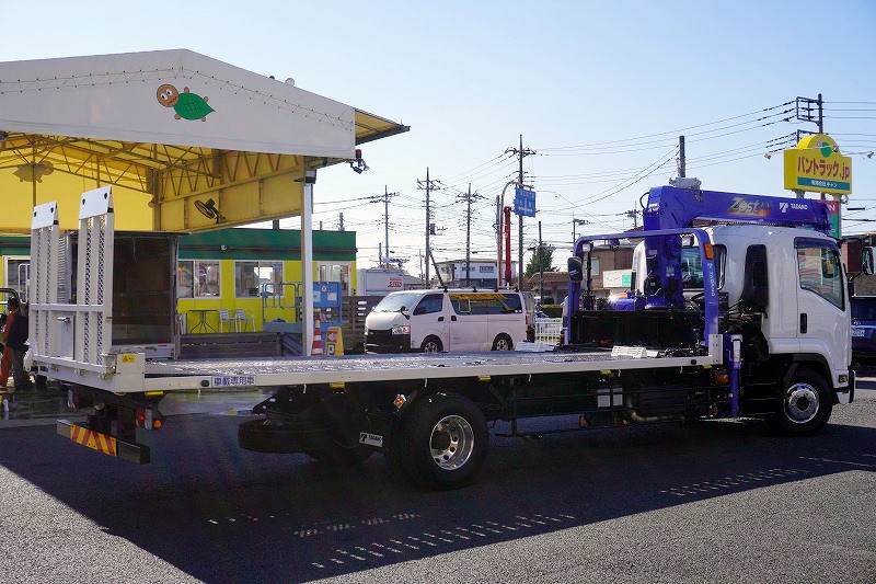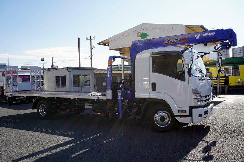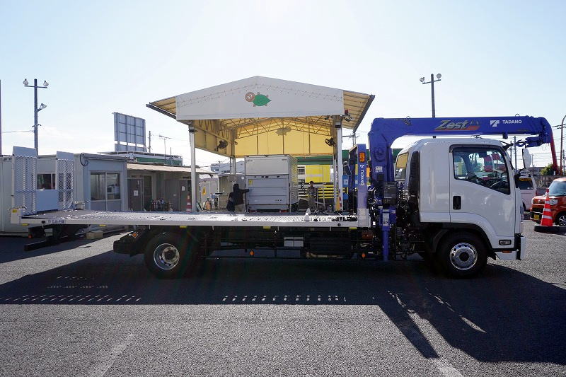 在庫No.K-0153 フォワード 増トン 「標準幅 ベッド付き」 3段クレーン セーフティローダー ウインチ付き 車載専用 積載4100kg タダノ製 アオリ無し 2.93t吊 ラジコン フックイン 6.3m長 荷台シマ板張り 床フック 社外ナビ TV バックカメラ アルミホイール AT車 高年式!低走行!中型免許対応!希少車!!