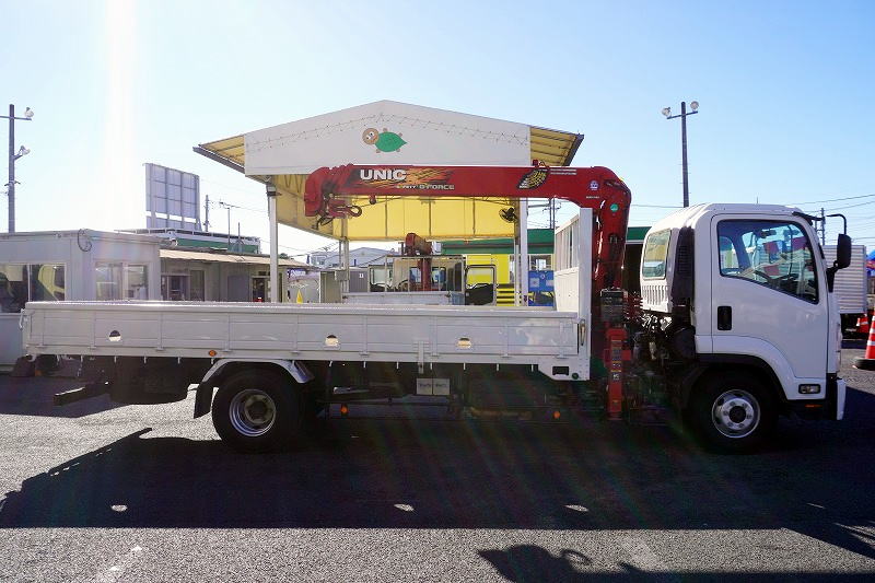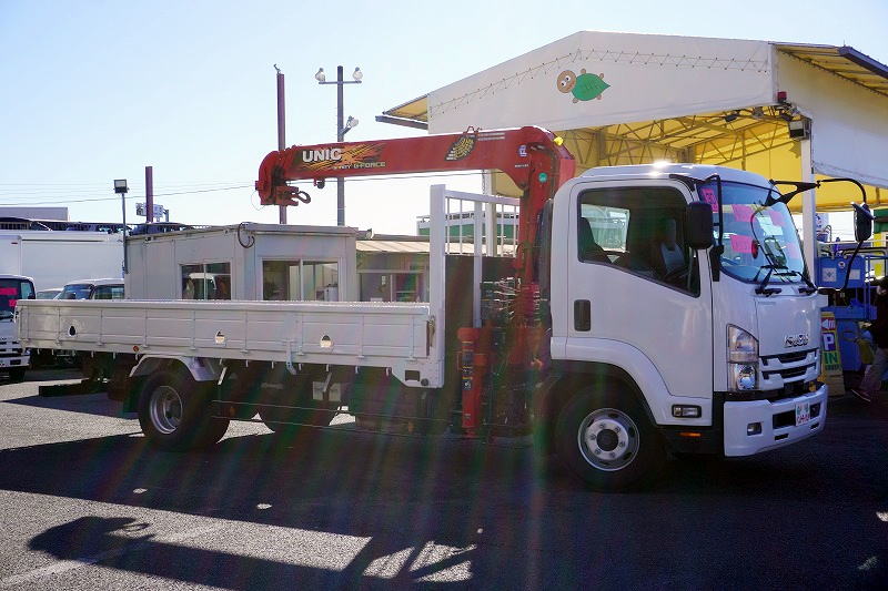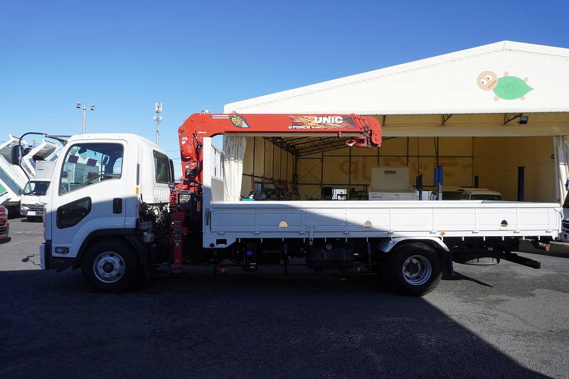 在庫No.C-0993 フォワード 4トン 「標準幅 ベッドレス」 4段クレーン 積載2500kg 古河ユニック製 5.4m長 ラジコン フックイン 2.93t吊 セイコーラック ロープ穴3対 ETC 低走行!AT車!