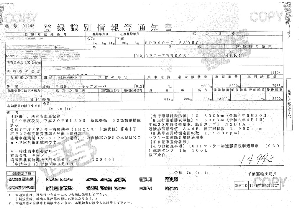 当店が把握できる車検証の表記より