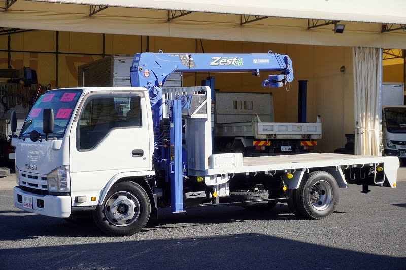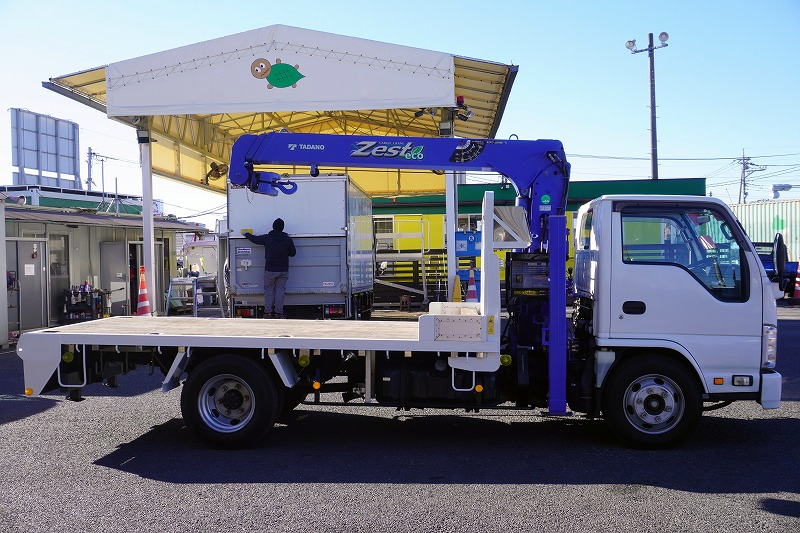 在庫No.K-0230 エルフ 「標準幅 ロング」 3段セルフクレーン 積載3550kg タダノ製 ラジコン フックイン 2.63t吊 アユミ板掛け 造りボディー 鳥居下部鉄板張り 床フック 左電格ミラー 坂道発進補助 社外ナビ ETC 6速MT!希少車!!
