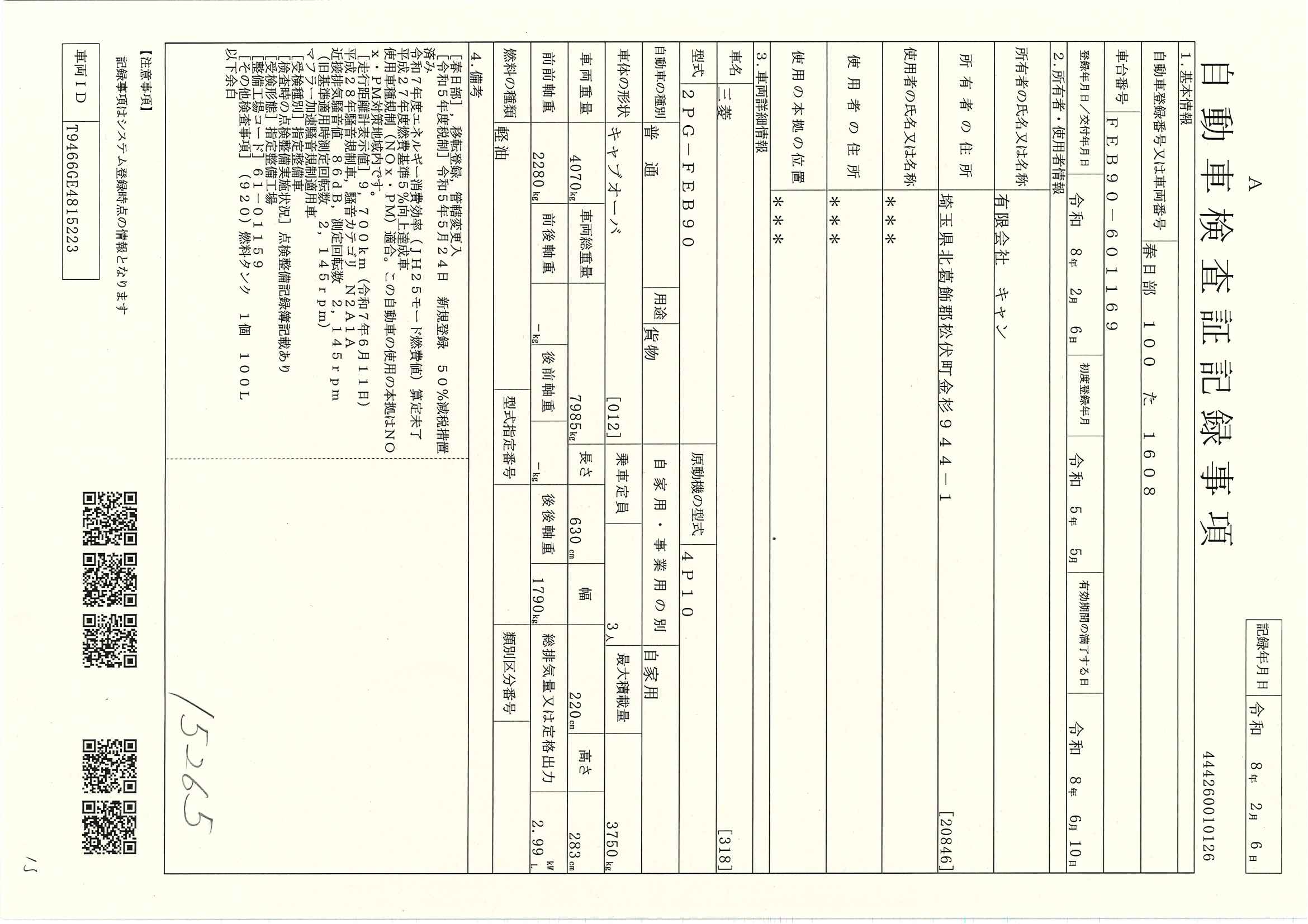 当店が把握できる車検証の表記より