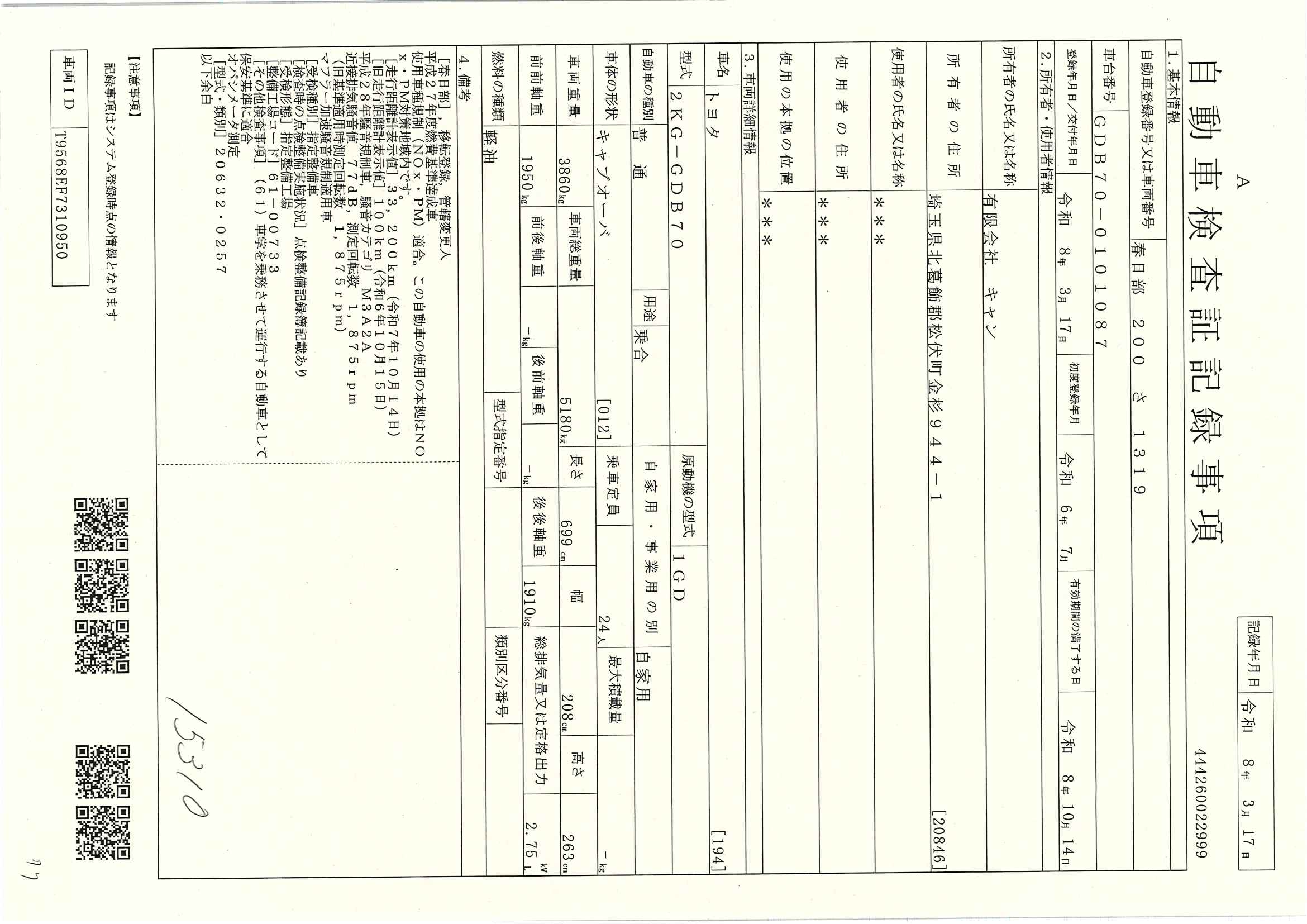当店が把握できる車検証の表記より