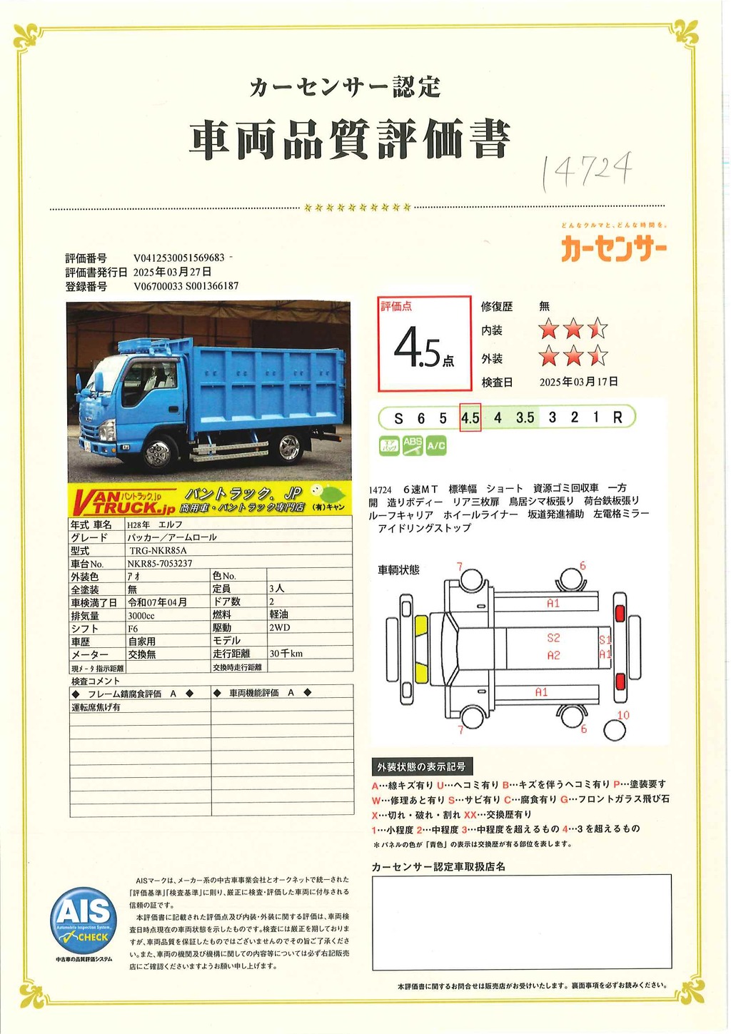 在庫No.C-0724 エルフ 「標準幅 ショート」 資源ゴミ回収車 積載2000kg 一方開 造りボディー リア三枚扉 鳥居シマ板張り 荷台鉄板張り ルーフキャリア 坂道発進補助 フォグランプ メッキホイールライナー 6速MT!希少車!!程度良いです