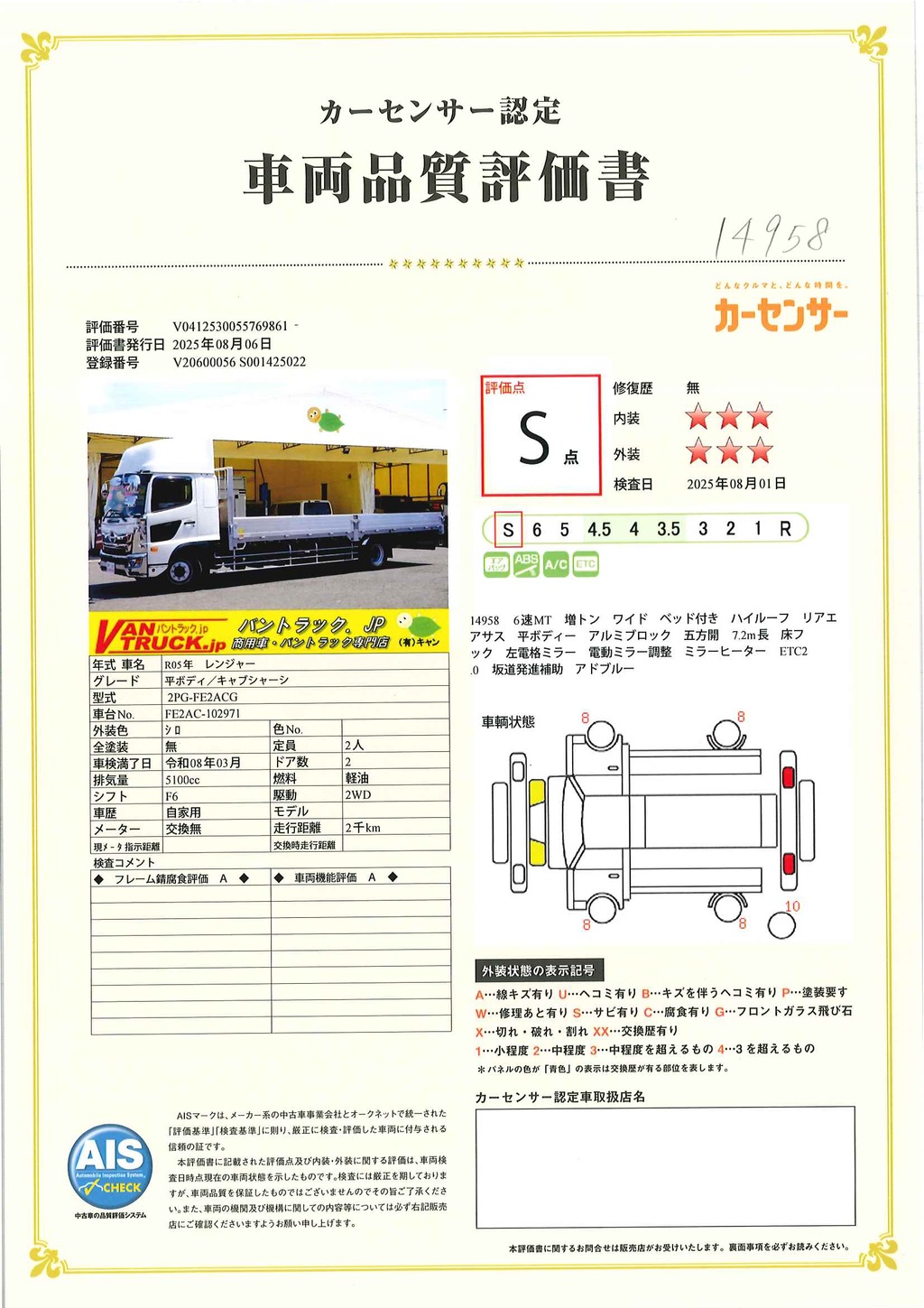 在庫No.C-0958 (未使用) レンジャー 増トン 「ワイド ハイルーフ ベッド付き」 平ボディー アルミブロック リアエアサス 積載8300kg 7.2m長 五方開 坂道発進補助 LEDヘッドライト フォグランプ オートエアコン ETC2.0 衝突軽減ブレーキ 車線逸脱警報 6速MT! 車検「R8年3月まで!」