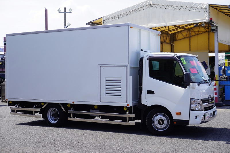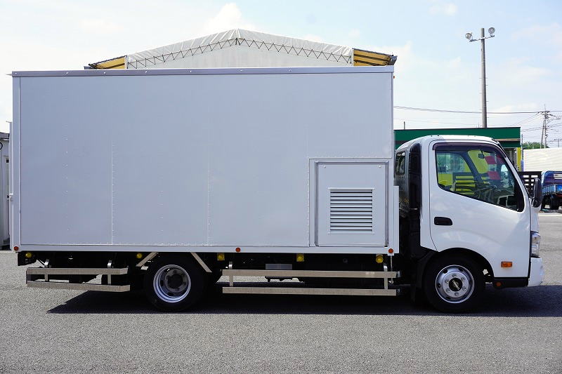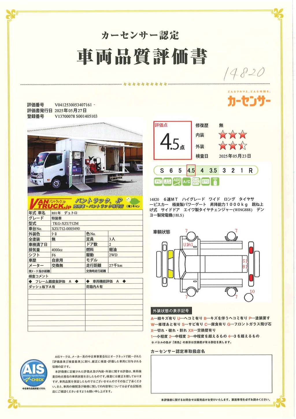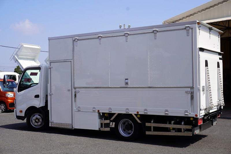 在庫No.C-0820 デュトロ 「ハイグレード ワイドロング」 タイヤサービスカー 積載500kg サイドドア 跳ね上げ式 パワーゲート 荷台シマ板張り 助手席側箱側面跳ね上げ式 バックカメラ 社外ナビ ETC2.0 左電格ミラー 坂道発進補助 ステンレスサイドバンパー 社外テール フォグランプ 衝突軽減ブレーキ 車線逸脱警報 6速MT!低走行!希少車!!