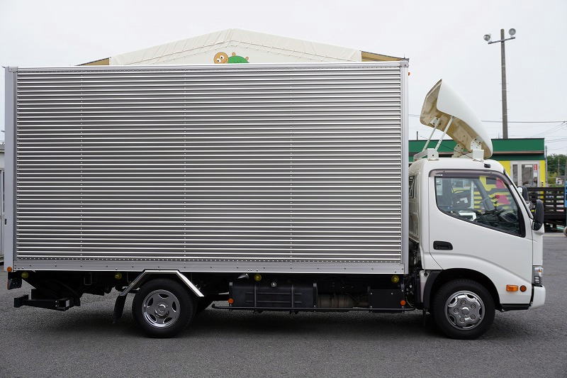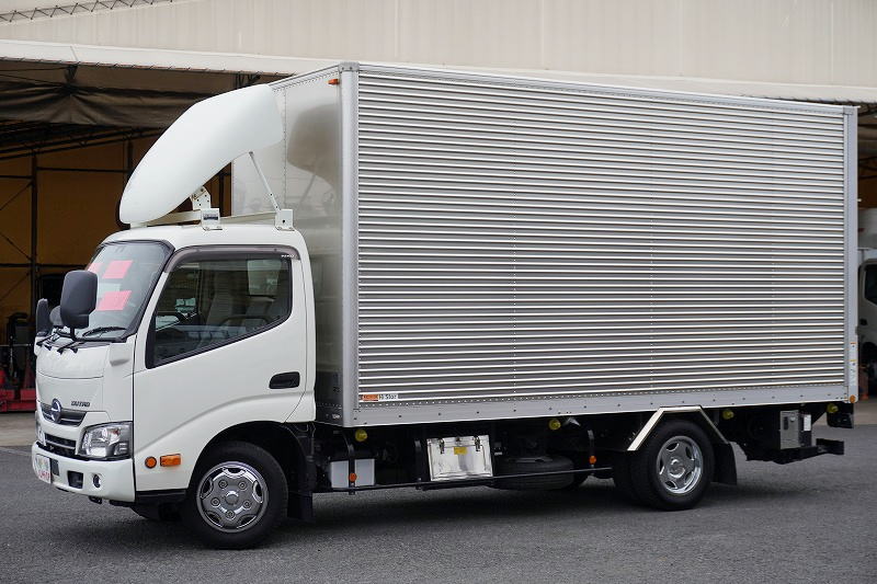 在庫No.C-0858 デュトロ 「標準幅 ロング」 アルミバン 積載2000kg 跳ね上げ式 パワーゲート ラッシング3段 ラジコン バックカメラ ETC2.0 左電格ミラー 坂道発進補助 スマートキー 電動パーキングブレーキ LEDヘッドライト&フォグランプ 導風板 メッキホイールライナー 5速MT!