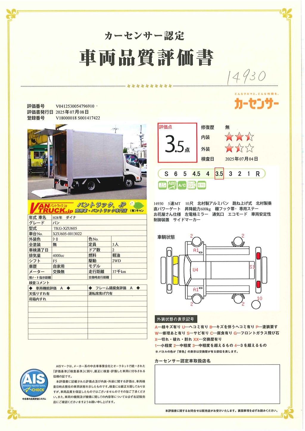 在庫No.C-0930 ダイナ 10尺 アルミバン 積載2000kg 跳ね上げ式 垂直パワーゲート 棚フック帯&専用ステー付き バックカメラ ETC 通気口 北村製 5速MT!お花屋さん仕様!