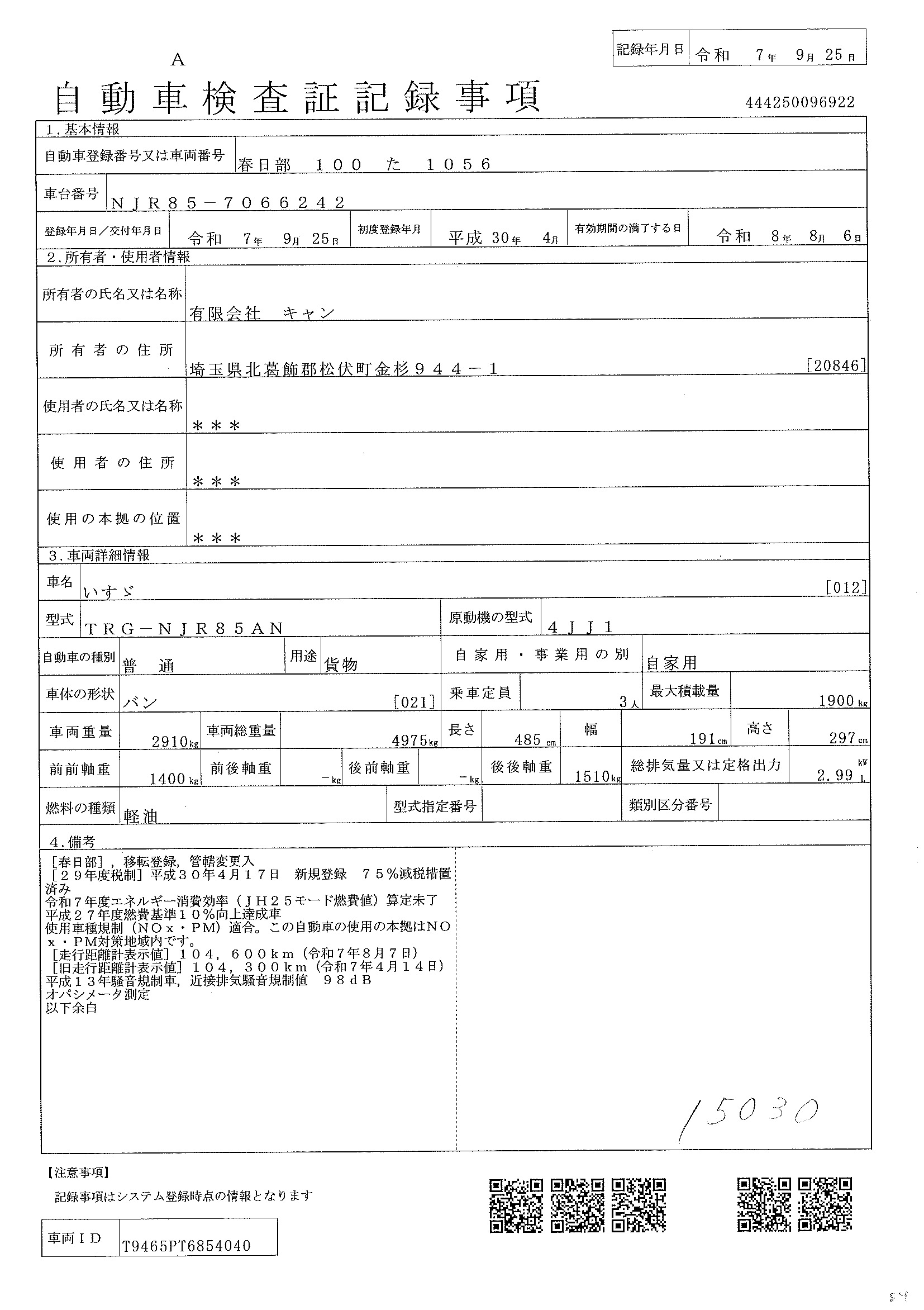 当店が把握できる車検証の表記より
