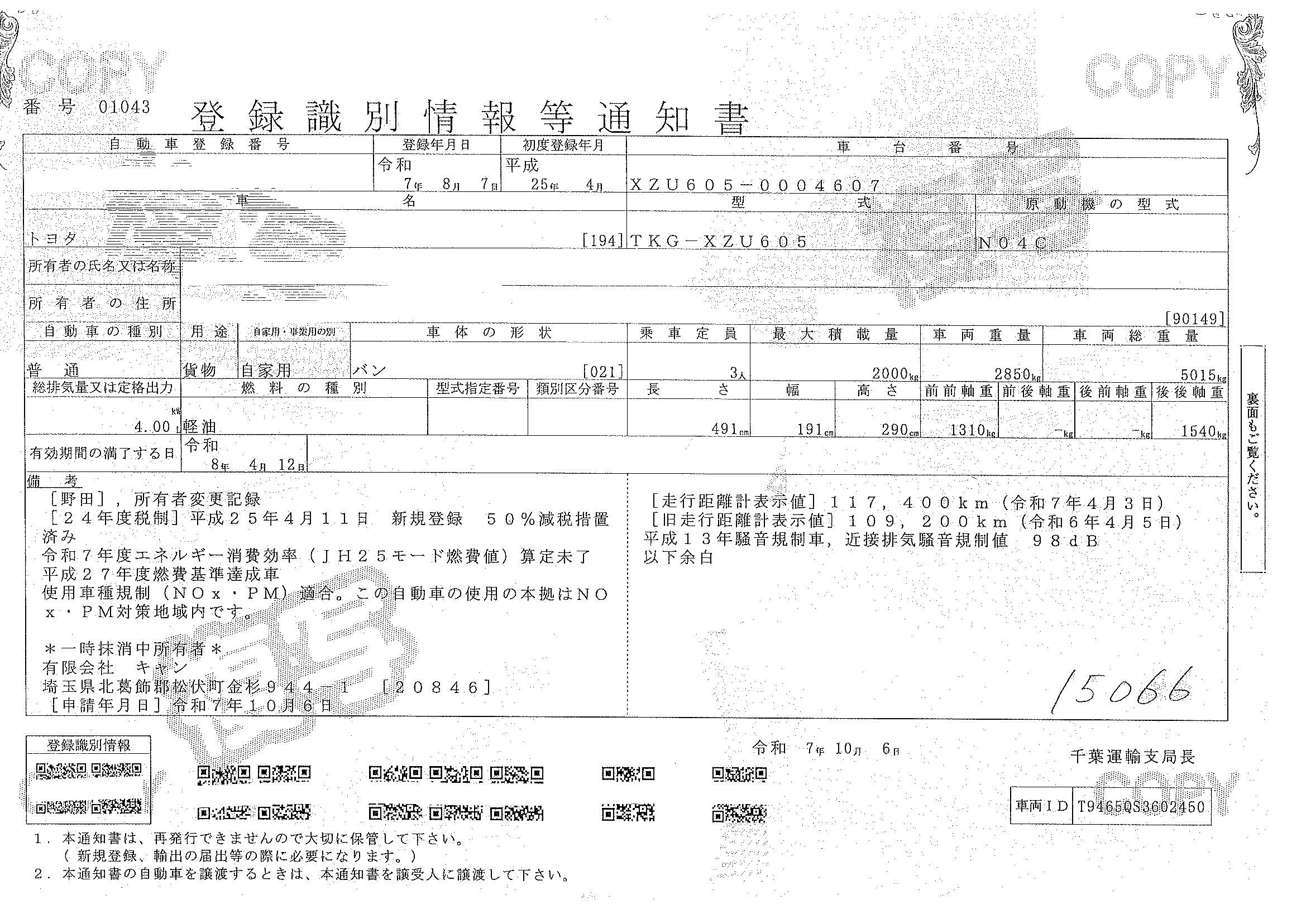当店が把握できる車検証の表記より