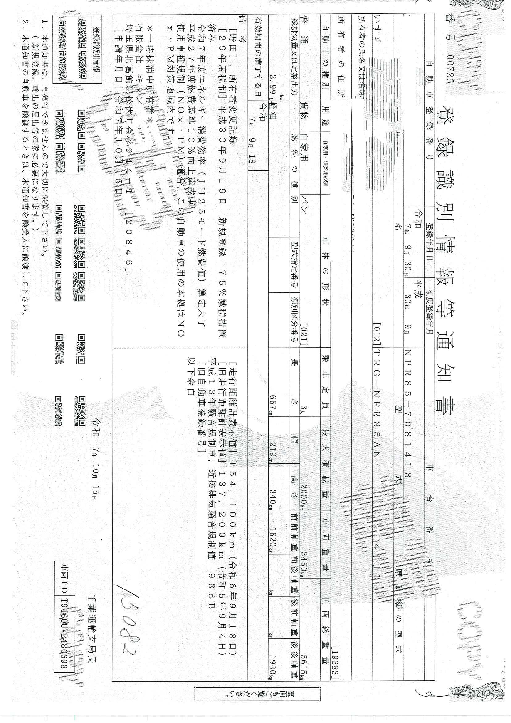 当店が把握できる車検証の表記より