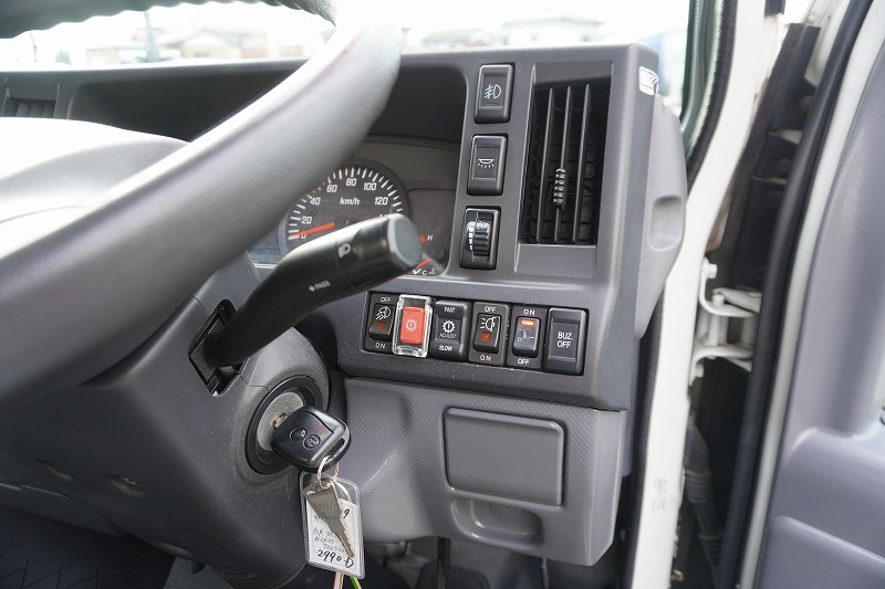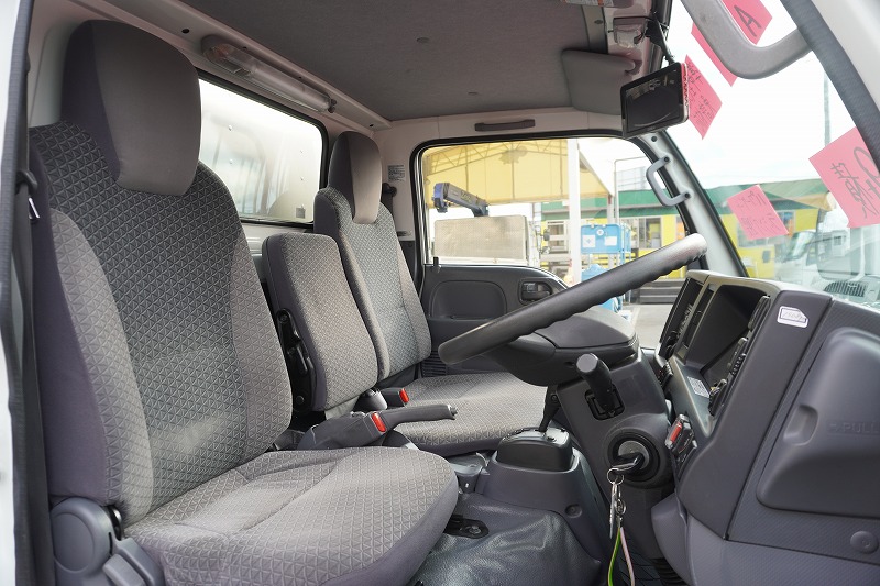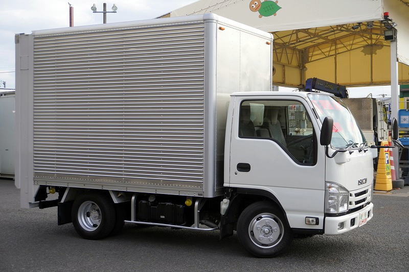 在庫No.K-0089 エルフ 10尺 アルミバン 積載1900kg 跳ね上げ式 垂直パワーゲート ラッシング2段 左電格ミラー バックカメラ フォグランプ 全低床 AT車!準中型(5トン限定)免許対応! 車検「R8年9月まで!」