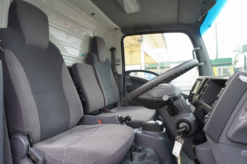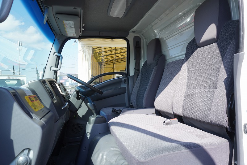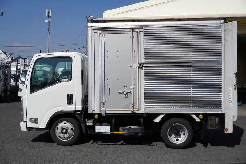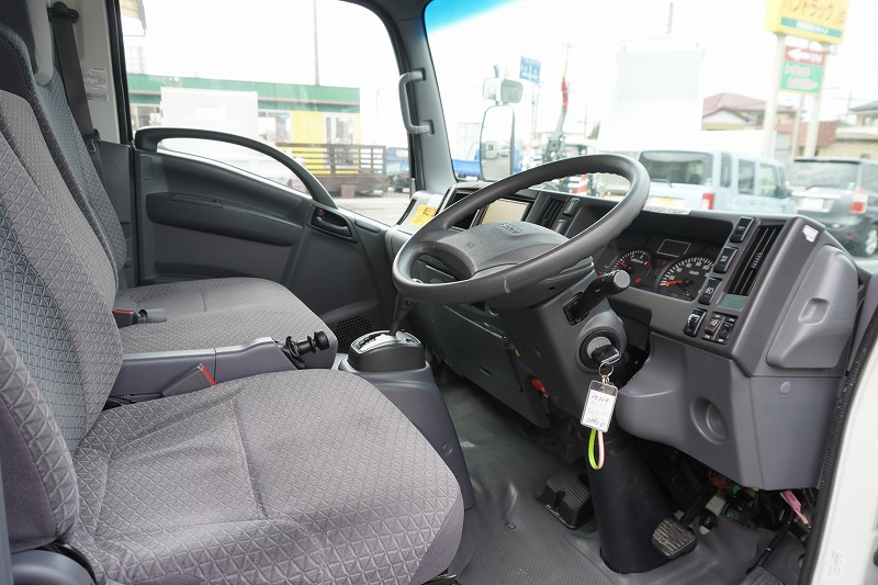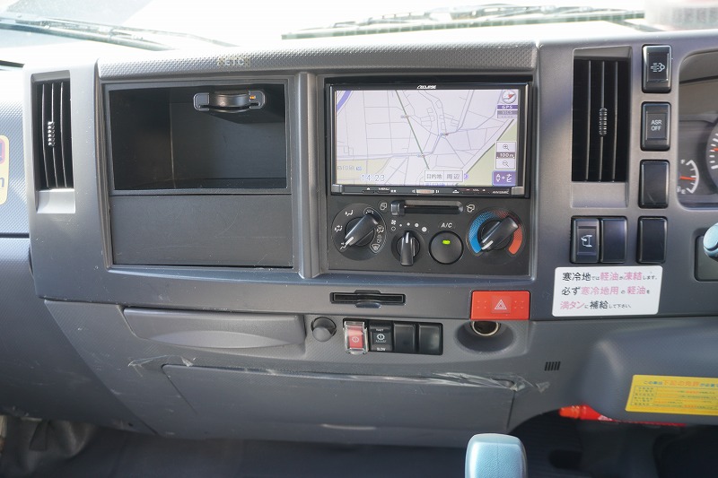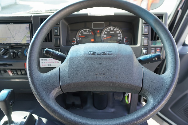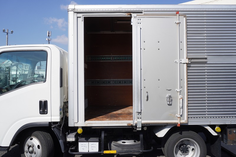 在庫No.K-0324 エルフ 10尺 アルミバン 積載2000kg サイドドア 跳ね上げ式 垂直パワーゲート ラッシング2段 壁面フック3対 全高2.8m バックカメラ ETC 社外ナビ 左電格ミラー フォグランプ 電動パーキングブレーキ パブコ製 全低床 AT車!
