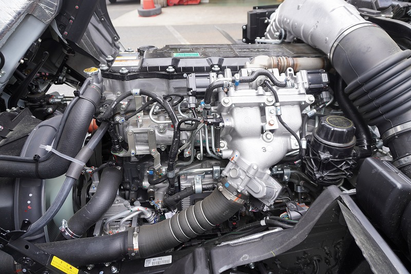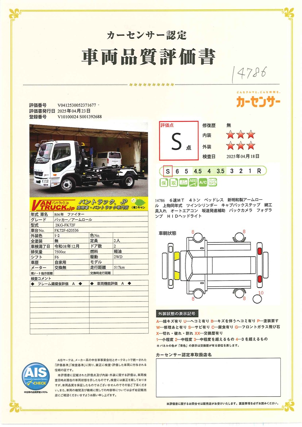 在庫No.C-0786 (未使用) ファイター 4トン 「ベッドレス」 アームロール 新明和製 積載3500kg ツインシリンダー キャブバックステップ 網工具入れ HIDヘッドライト フォグランプ 坂道発進補助 バックカメラ 衝突軽減ブレーキ 車線逸脱警報 6速MT! 車検「R8年12月まで!」