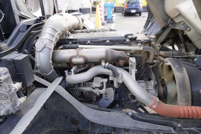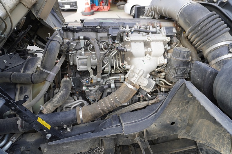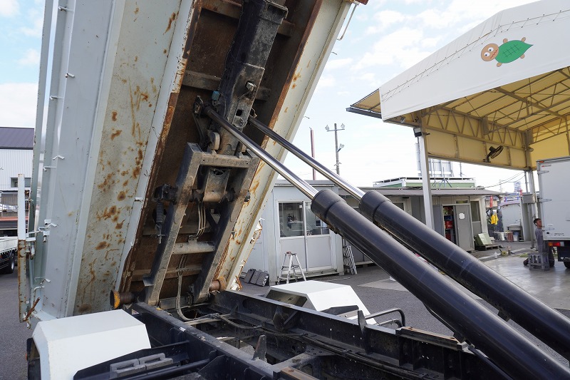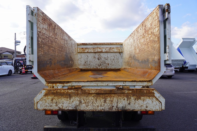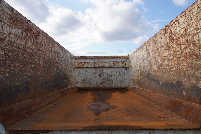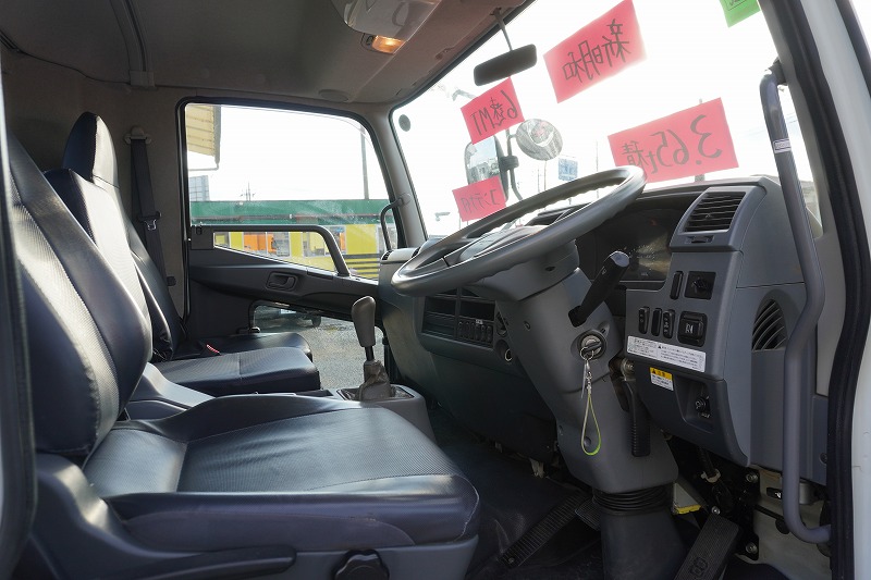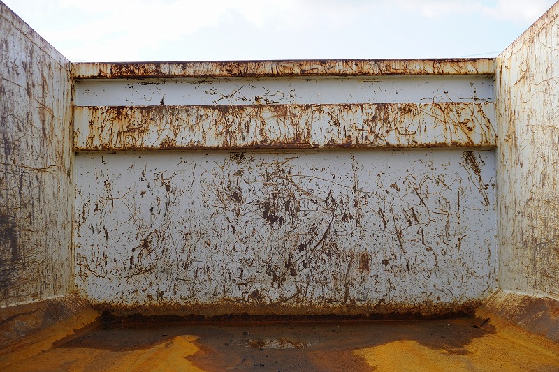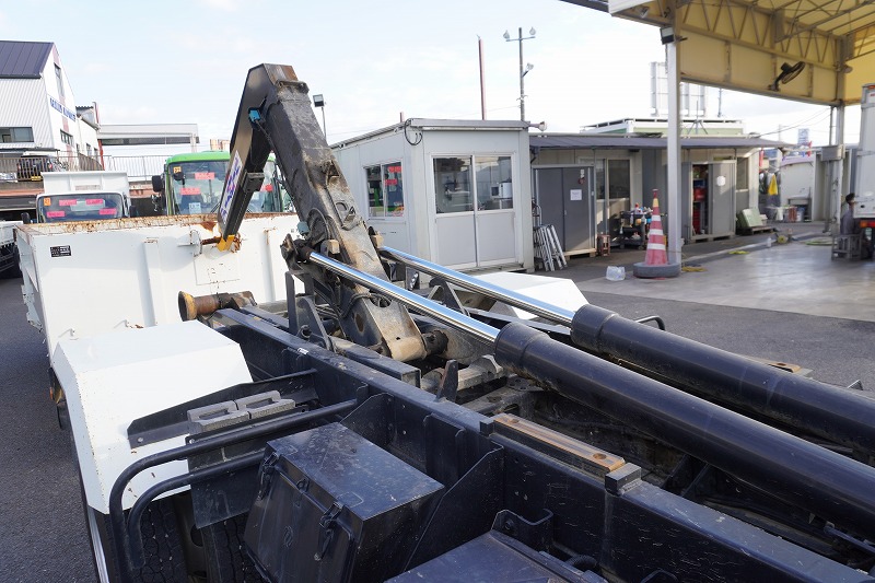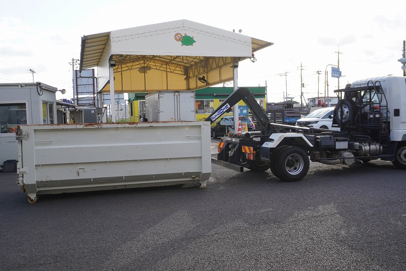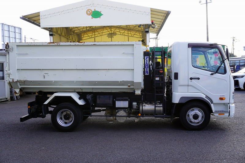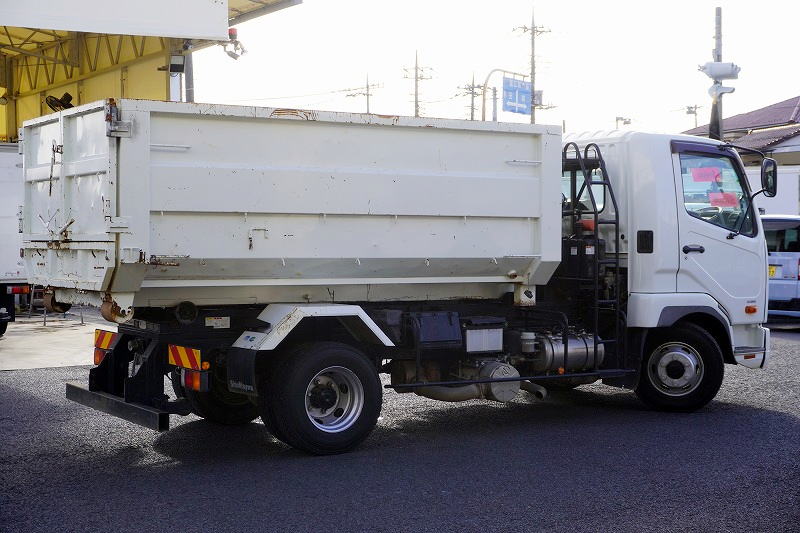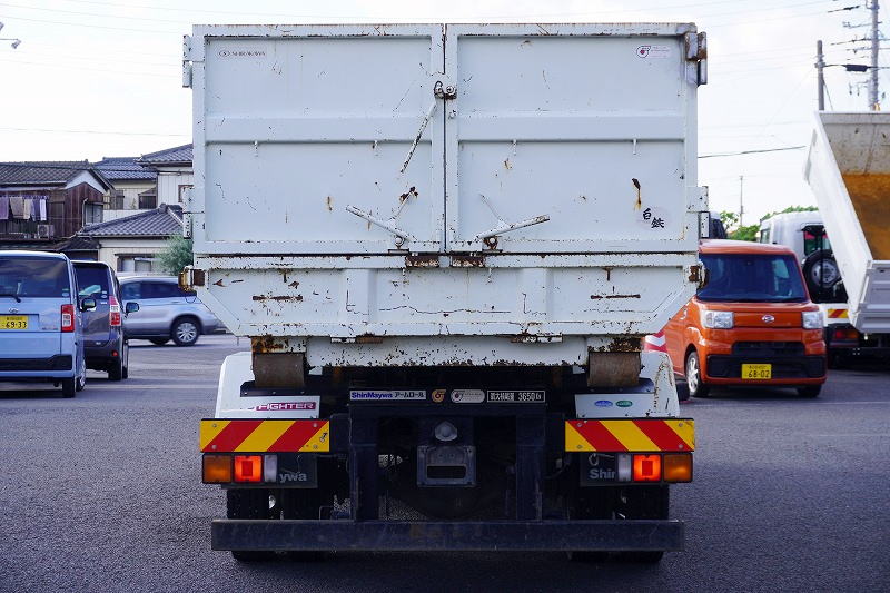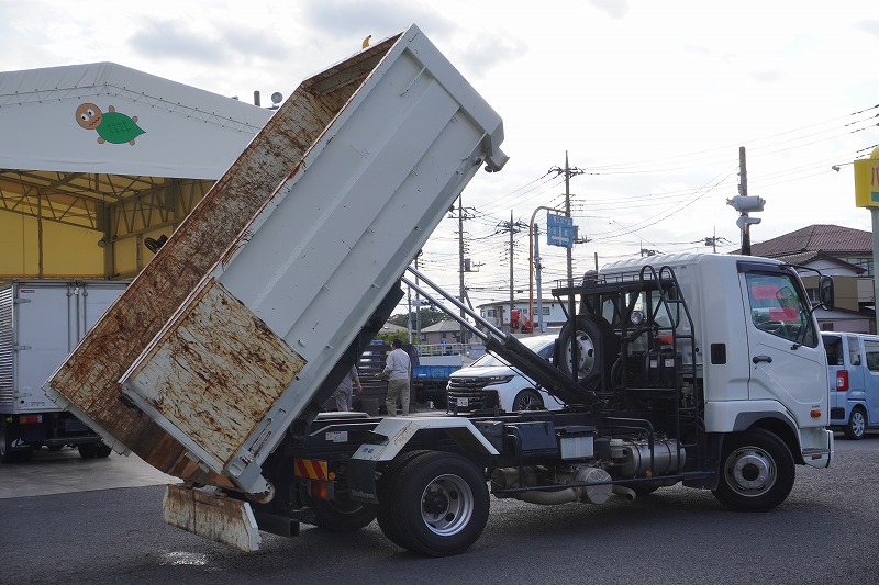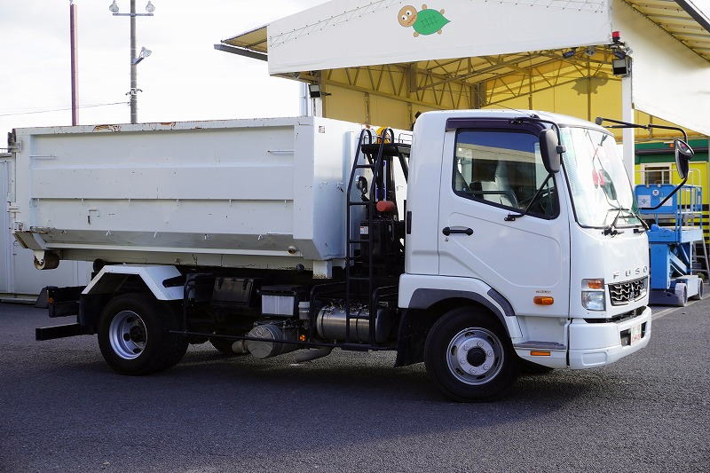 在庫No.K-0079 ファイター 4トン 「ベッドレス」 アームロール 新明和製 積載3650kg ツインシリンダー キャブバックステップ コンテナ付き 網工具入れ 坂道発進補助 ETC 低走行!6速MT! 車検「R8年5月まで!」
