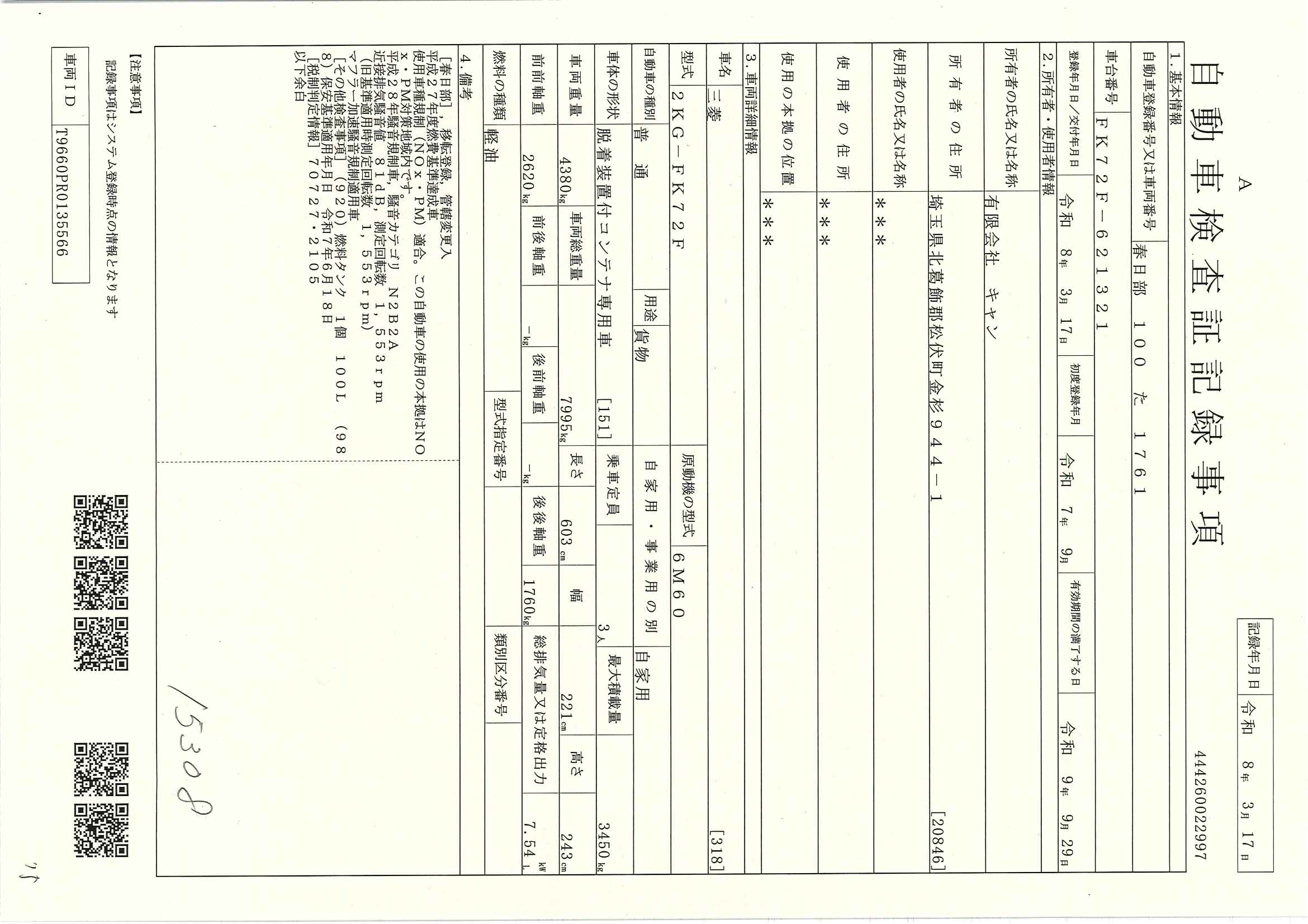 当店が把握できる車検証の表記より
