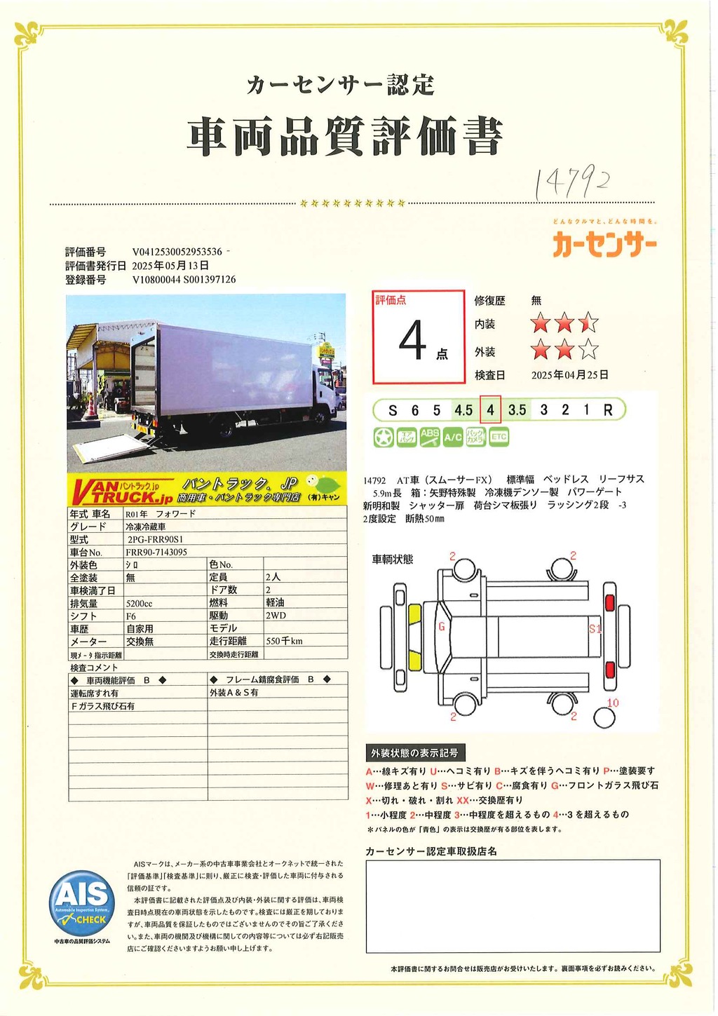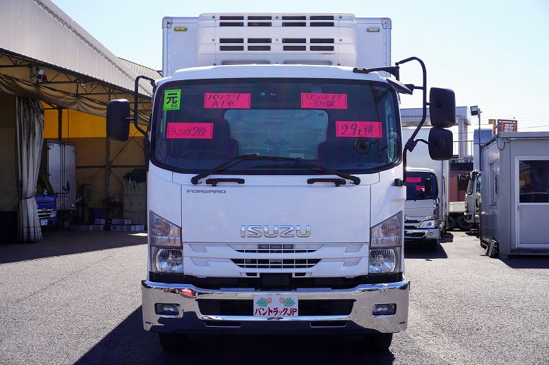 在庫No.C-0792 フォワード 4トン 「標準幅 ベッドレス」 冷蔵冷凍車 「矢野特殊」 積載2900kg パワーゲート リアシャッター扉 5.9m長 -32度設定 荷台シマ板張り ラッシング2段 バックカメラ ETC2.0 アルミホイール メッキパーツ HIDヘッドライト AT車!