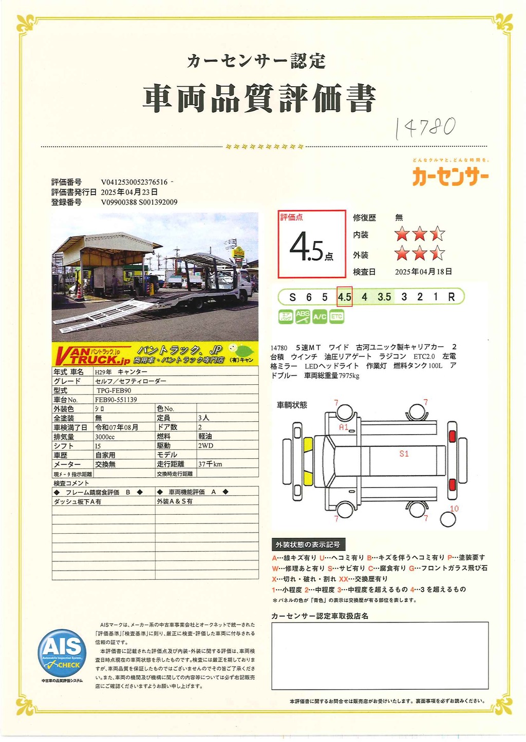 在庫No.C-0780 キャンター 「ワイド超ロング」 キャリアカー 2台積 古河ユニック製 積載3500kg ウインチ 油圧リアゲート ラジコン ETC2.0 左電格ミラー フォグランプ 5速MT!