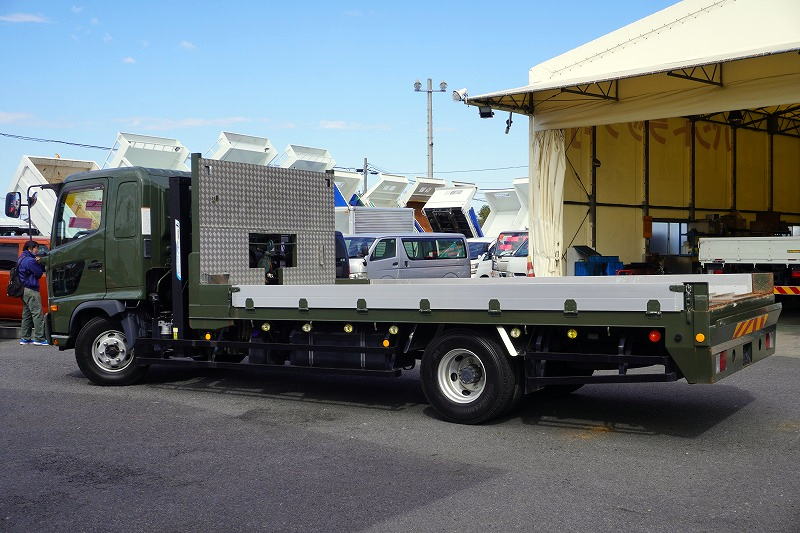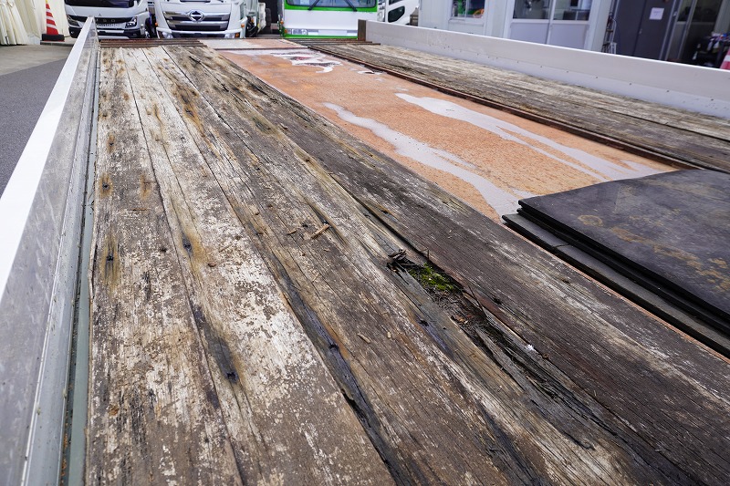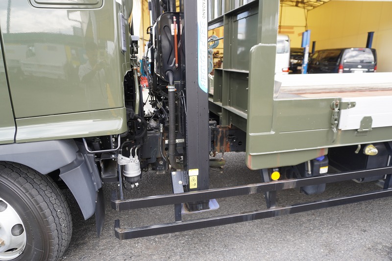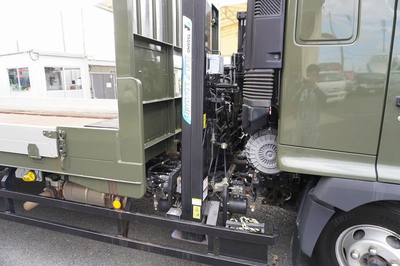在庫No.K-0111 レンジャー 4トン 「ワイド ベッド付き」 重機運搬車 タダノ製ハイジャッキ 造りボディー 積載2050kg ウインチ ラジコン アユミ板掛け アルミブロック 鳥居シマ板張り LED作業灯 坂道発進補助 ETC 衝突軽減ブレーキ 車線逸脱警報 低走行!6速MT!
