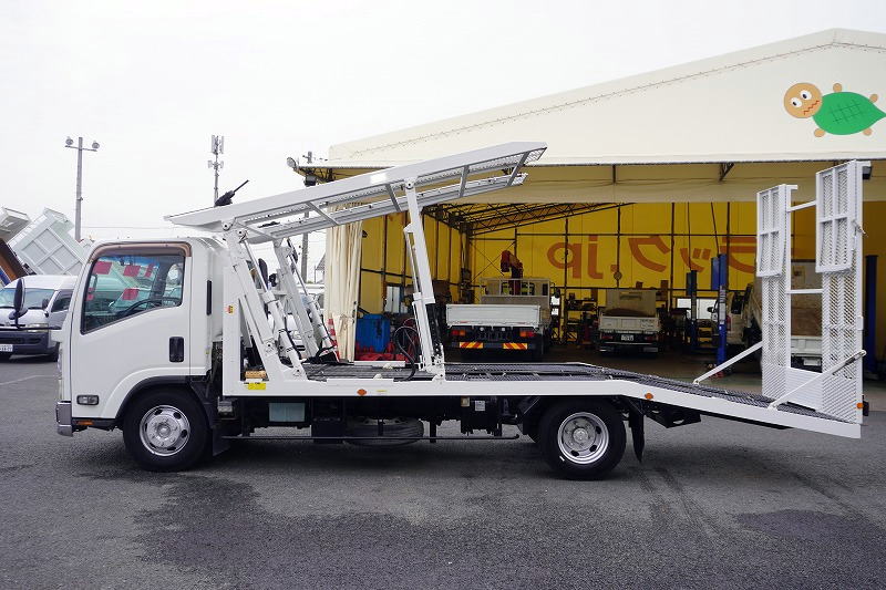 在庫No.K-0177 エルフ 「ワイド超ロング」 キャリアカー 2台積 花見台製 積載3650kg ウインチ 油圧リアゲート ラジコン 社外ナビ ETC 左電格ミラー 坂道発進補助 LEDヘッドライト フォグランプ メッキパーツ ワンオーナー!6速MT!