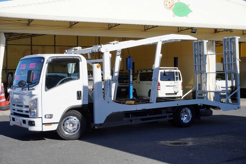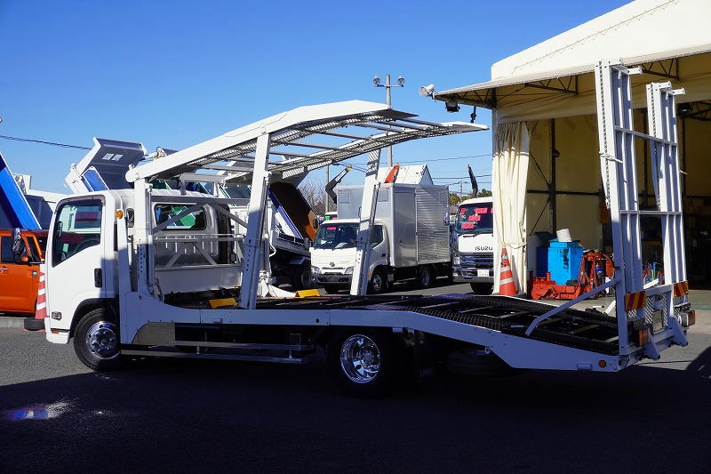 在庫No.K-0228 エルフ 「ワイド超ロング」 キャリアカー 2台積 古河ユニック製 積載3500kg ウインチ 油圧リアゲート ラジコン バックカメラ 社外ナビ ETC2.0 左電格ミラー 坂道発進補助 フォグランプ アルミホイール 6速MT! 車検「R8年11月まで!」