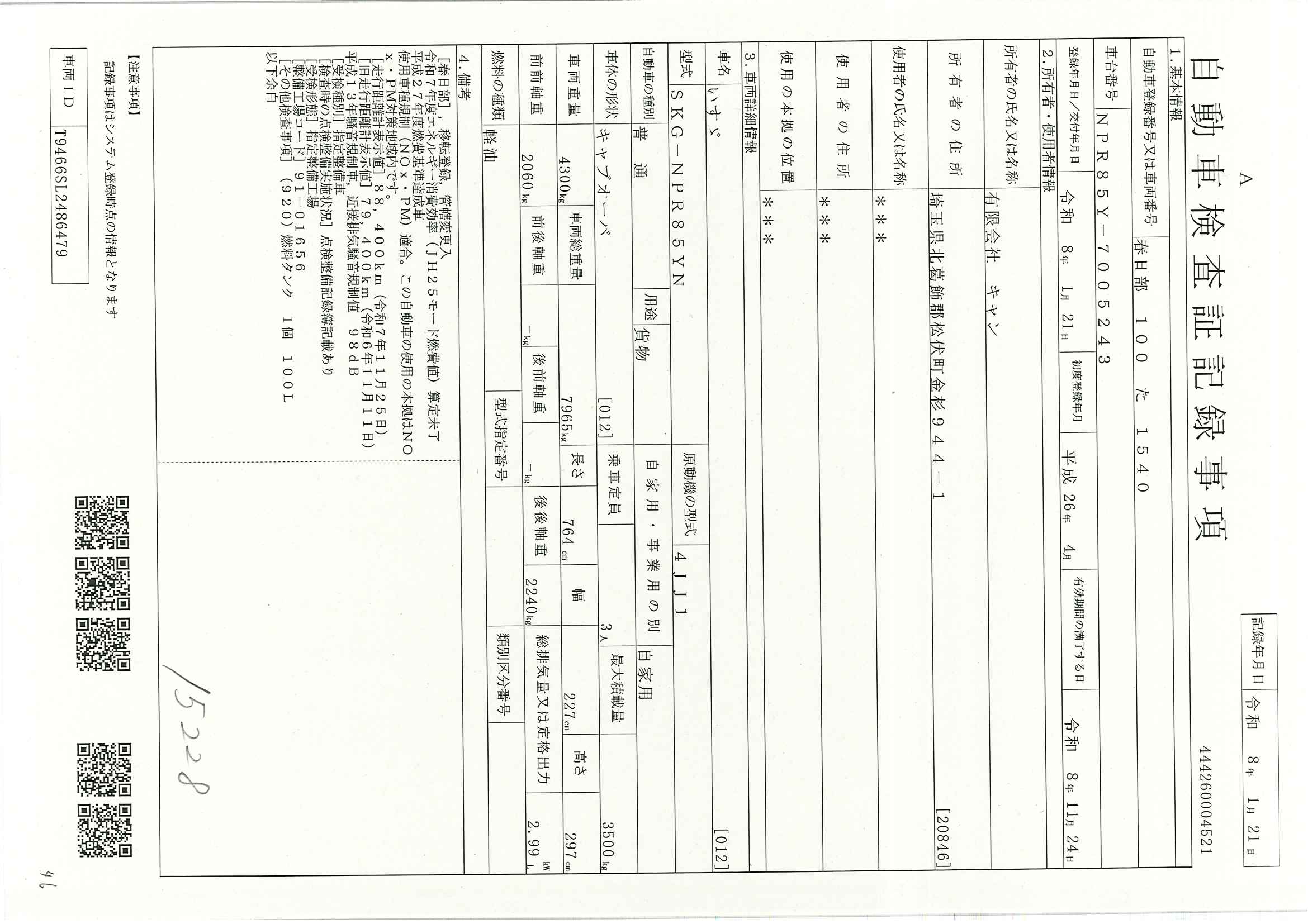 当店が把握できる車検証の表記より