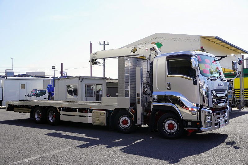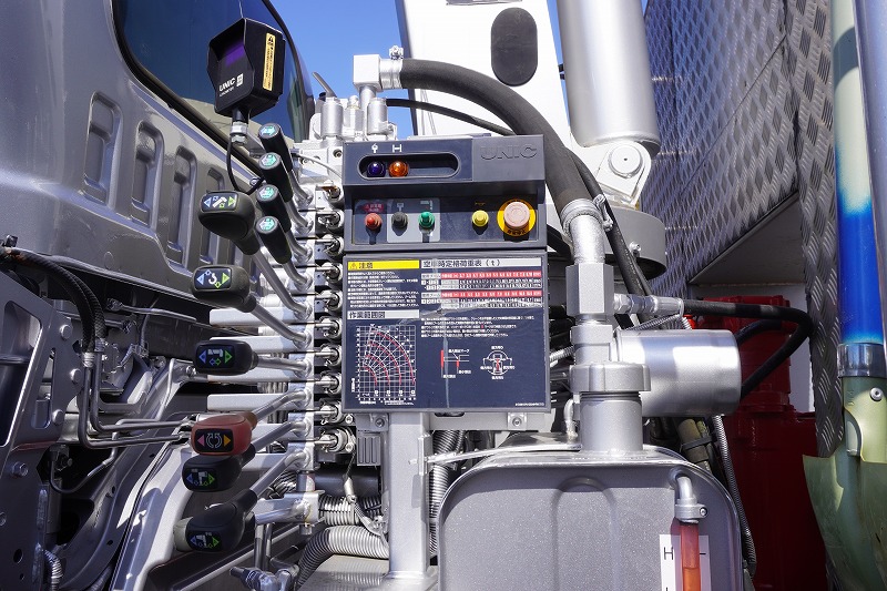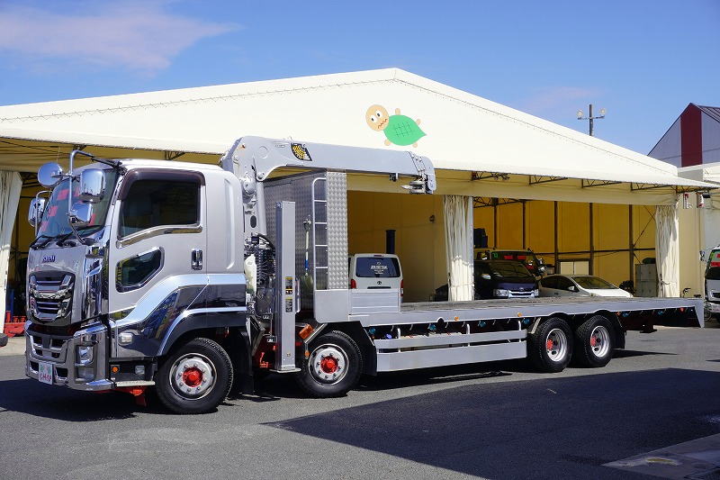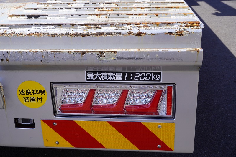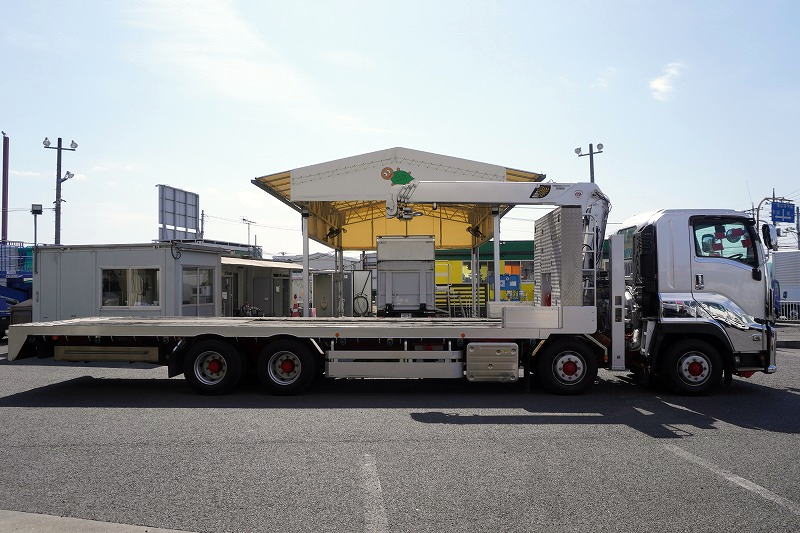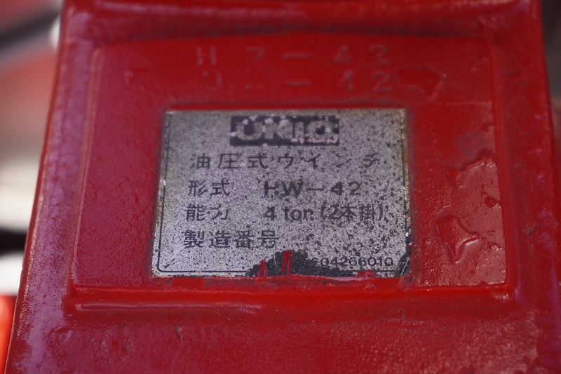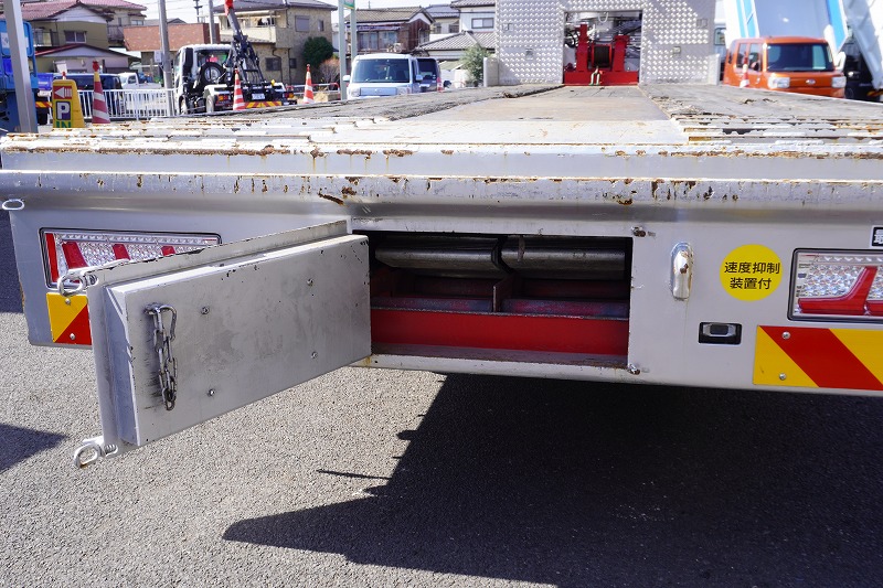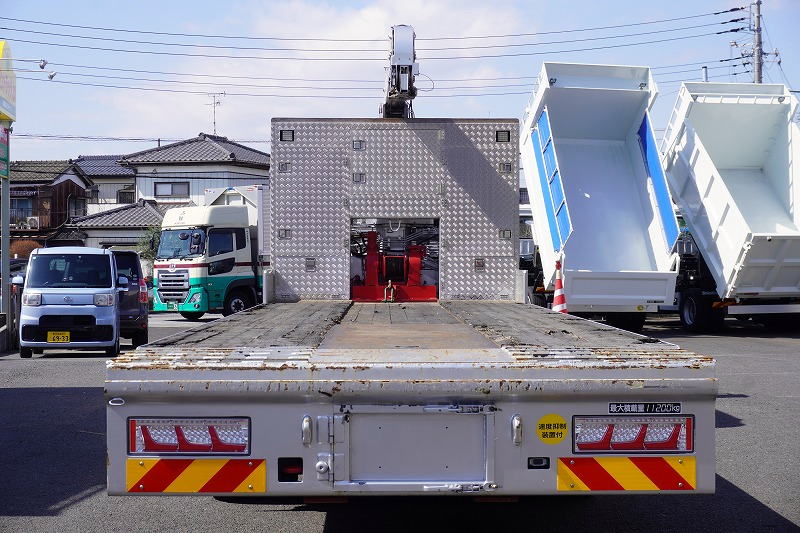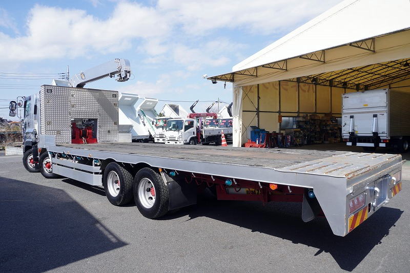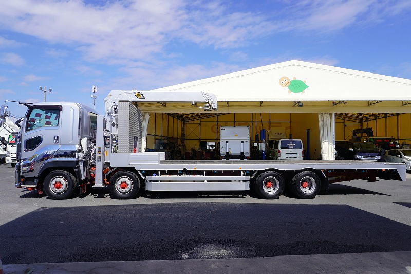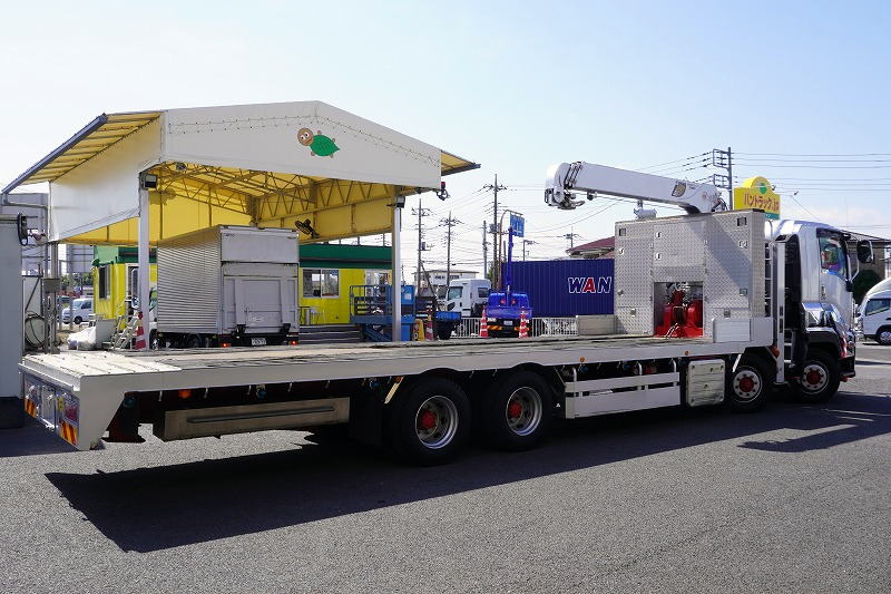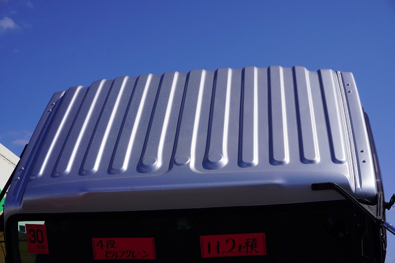 大型 四軸 寝台付 標準ルーフ 4段ユニック セルフクレーン 11.2トン積 ラジコン ウインチ 造りボディー 重機運搬 リターダー |